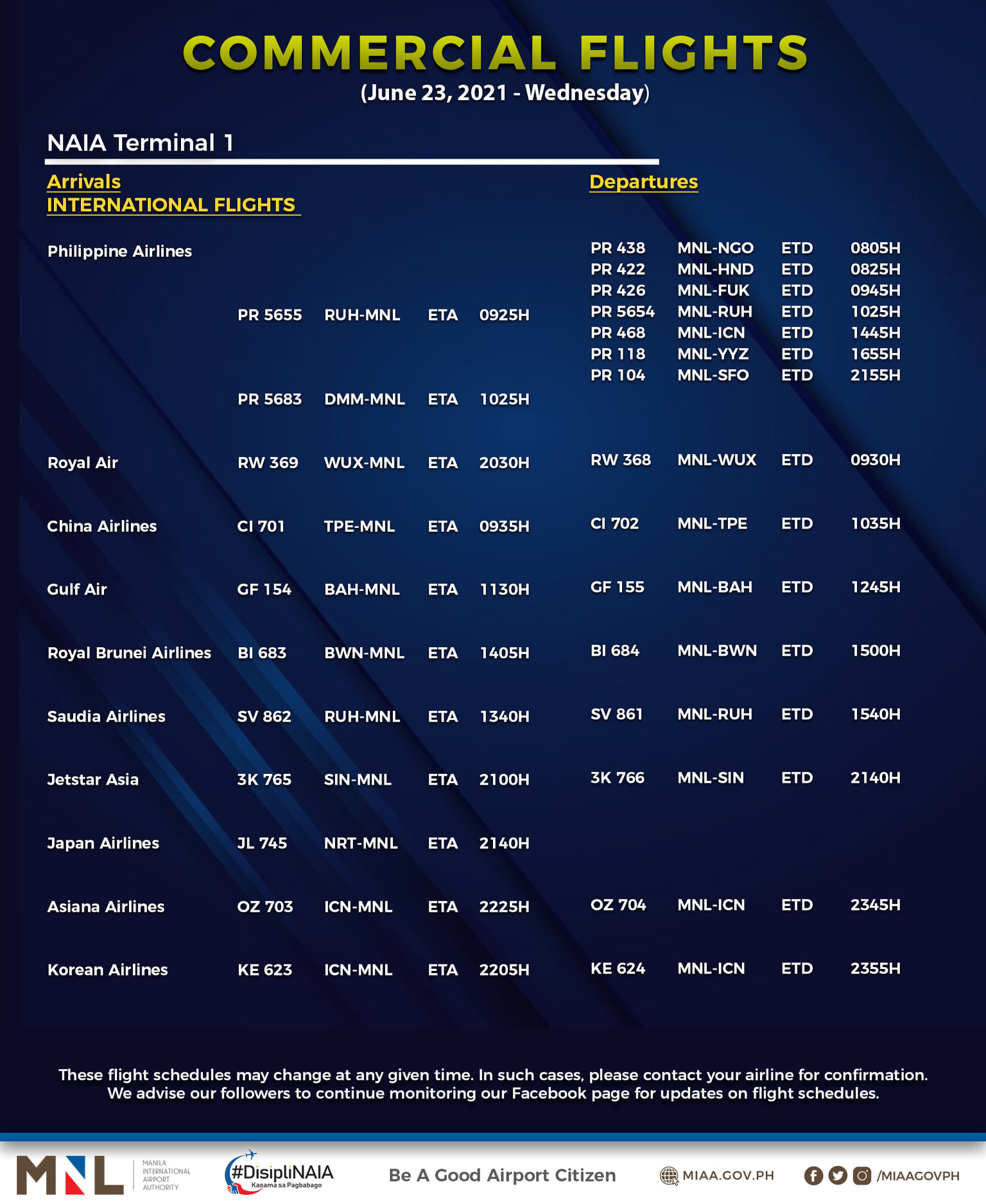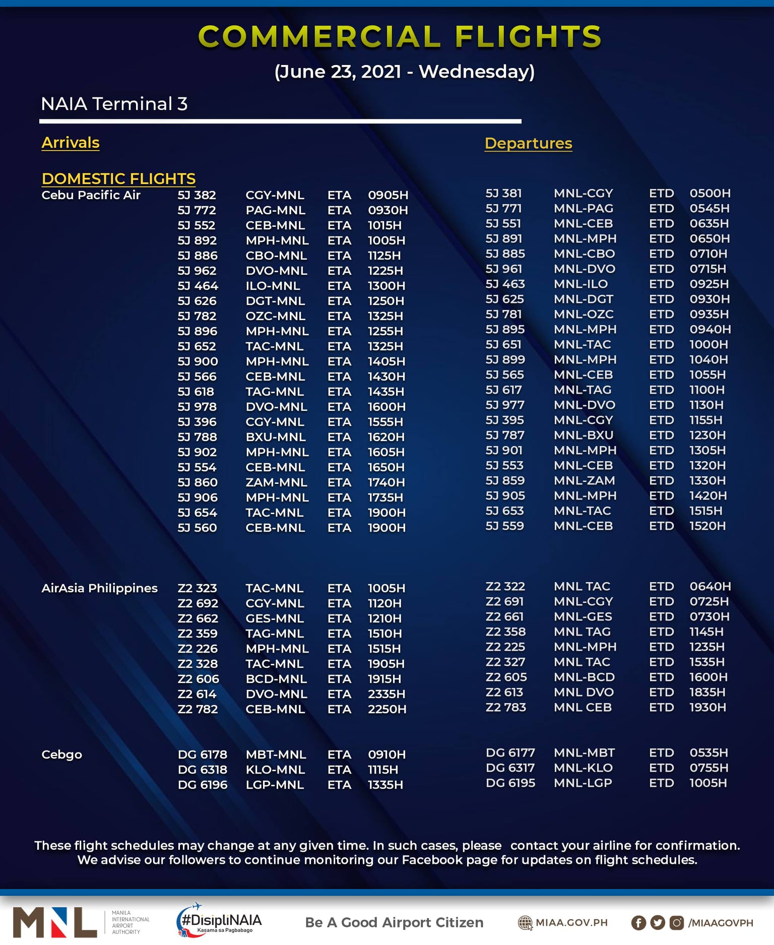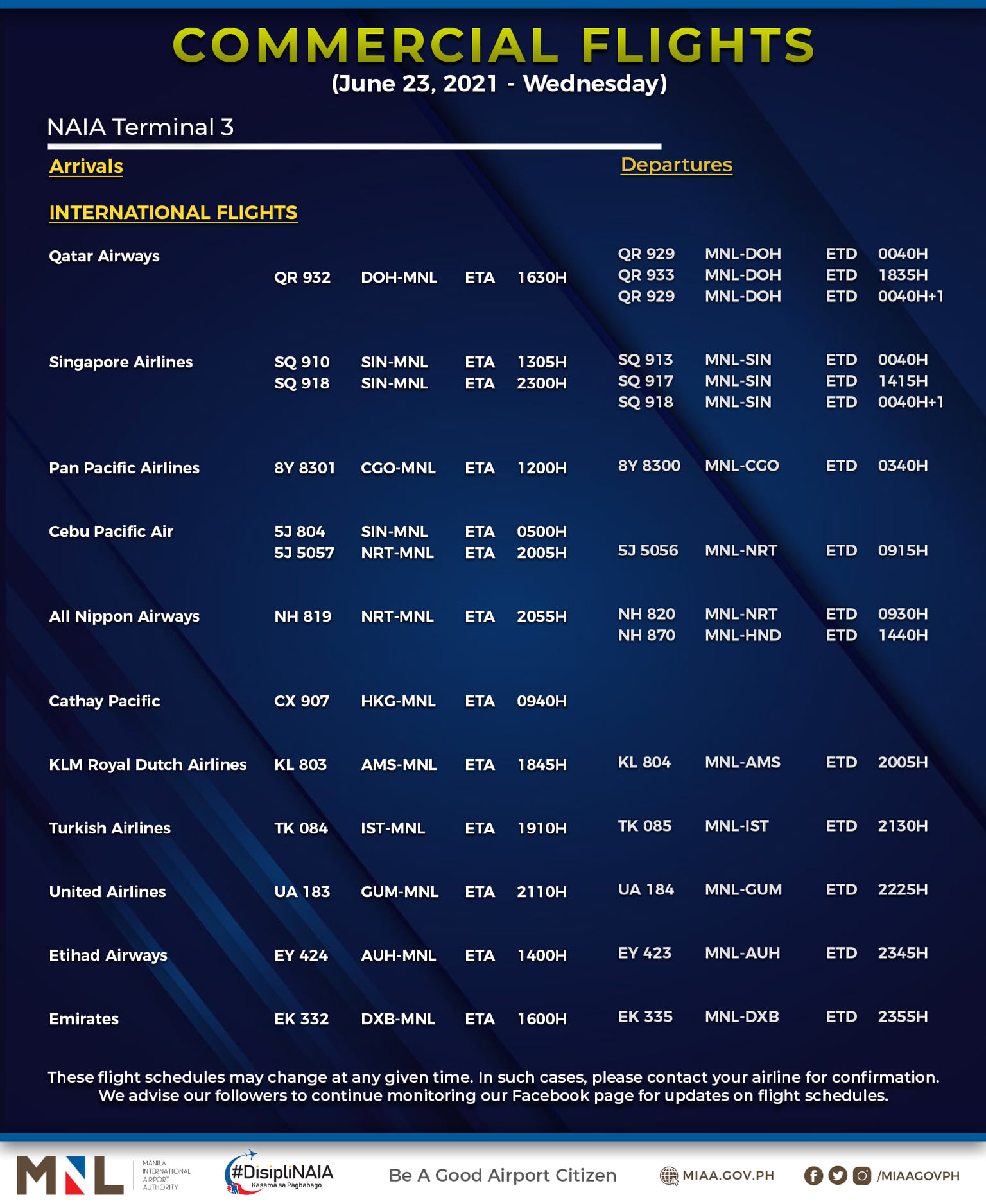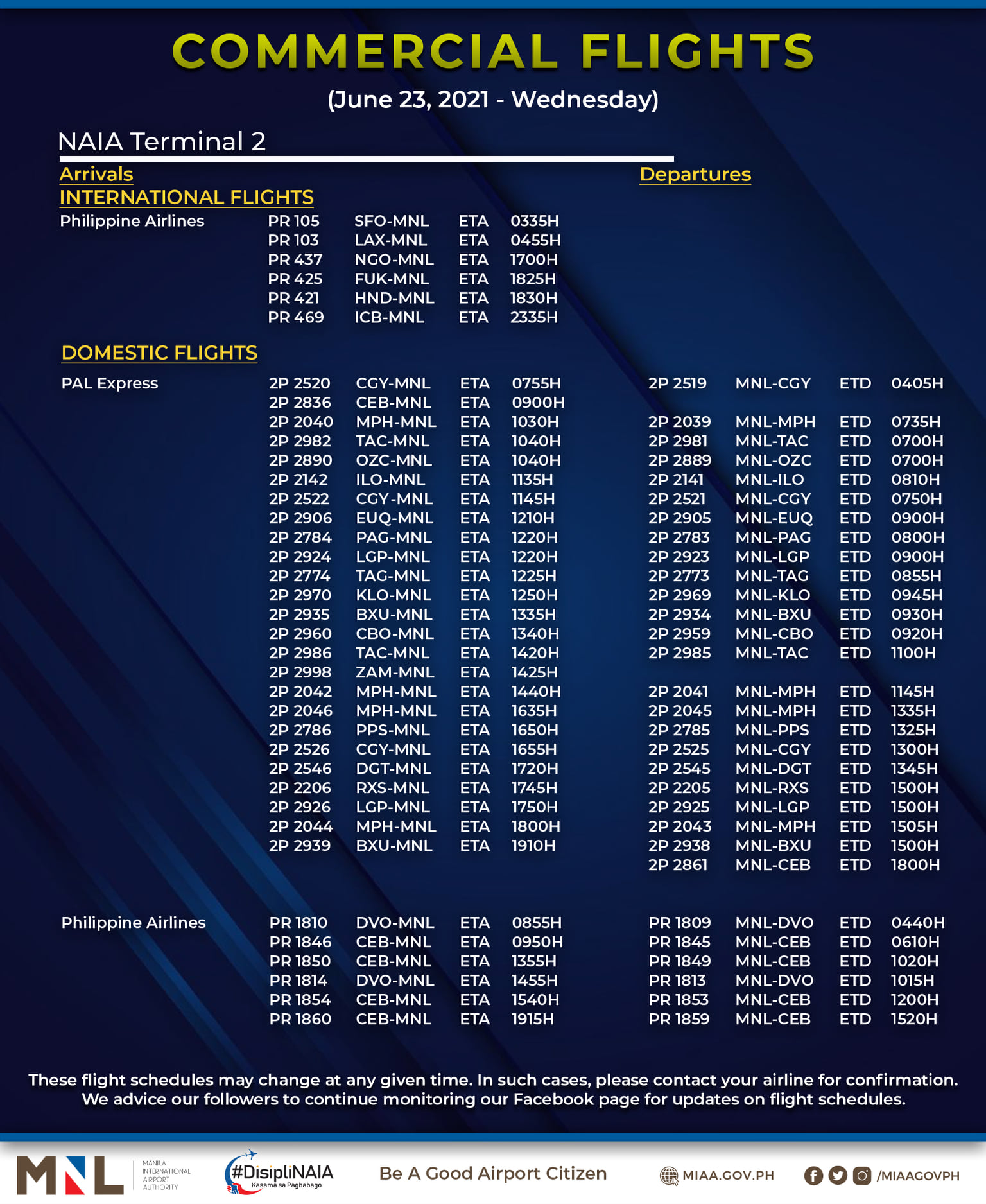 (Eagle News) — The Manila International Airport Authority has released its list of operational commercial flights for Wednesday, June 23: