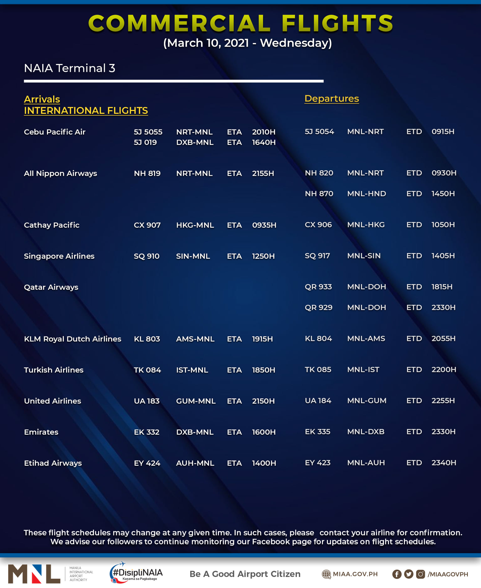(Eagle News) — The Manila International Airport Authority has released its list of operational commercial flights for Wednesday, March 10:
