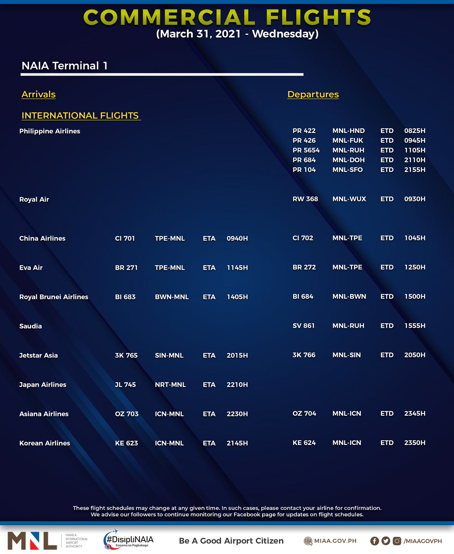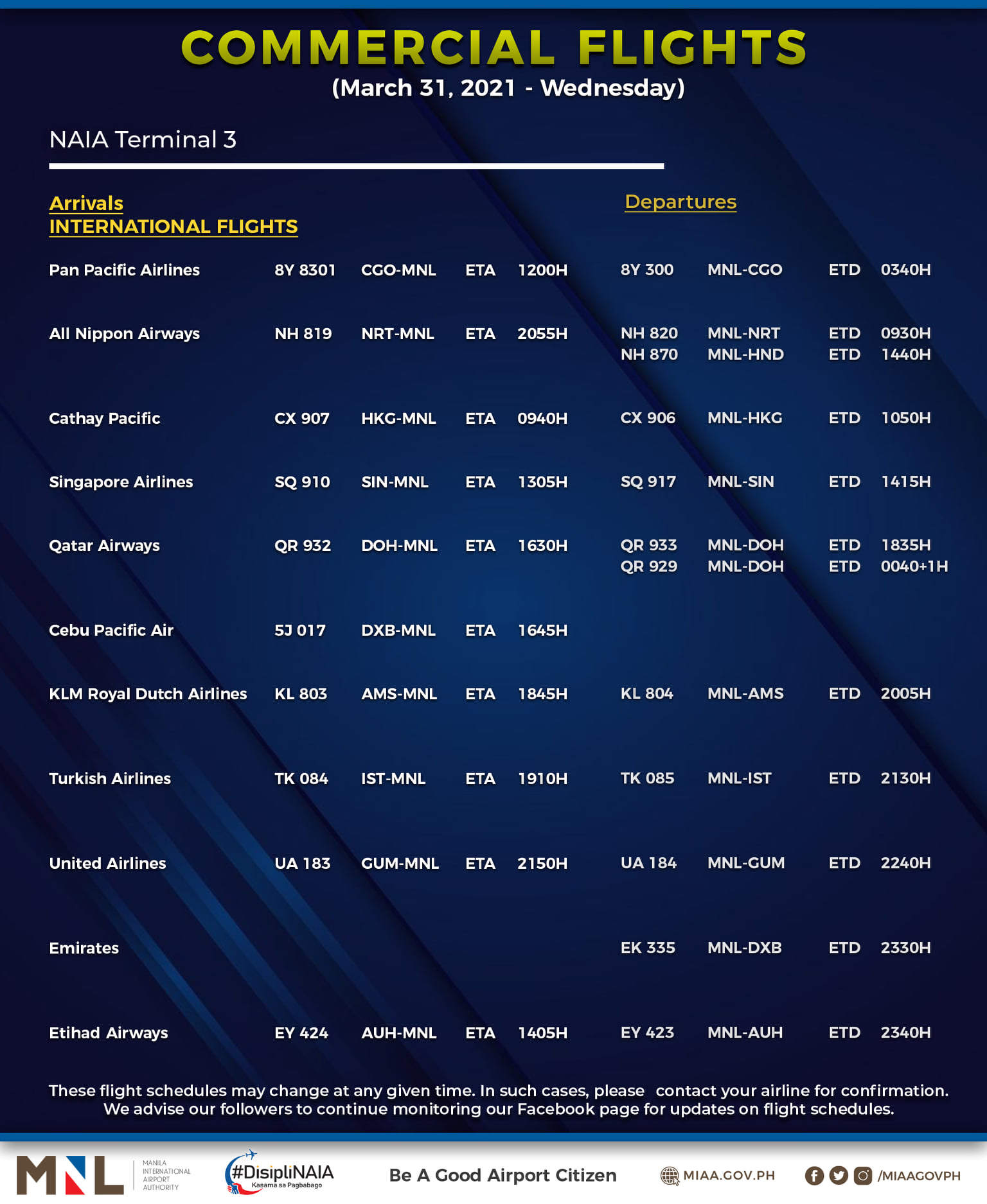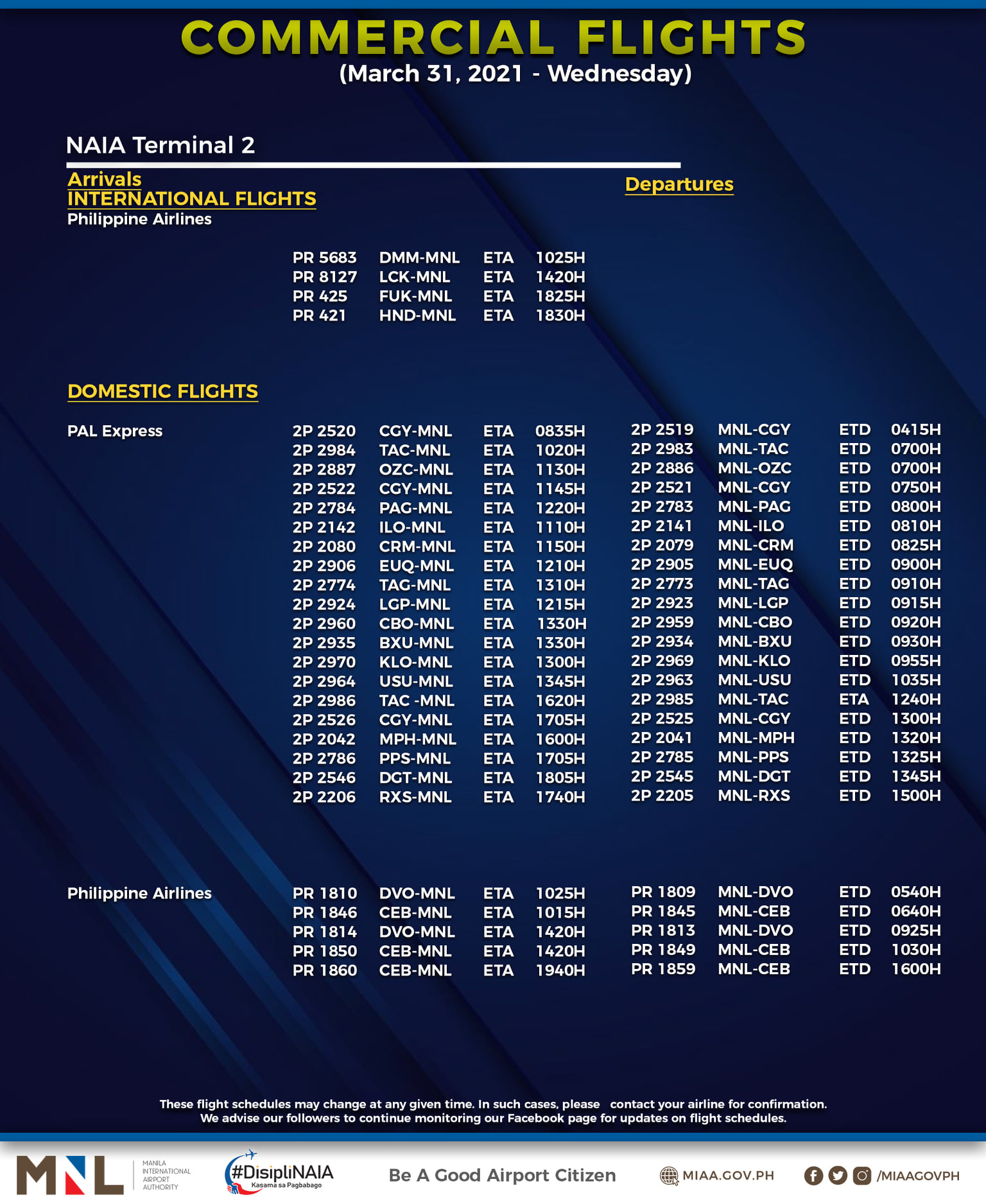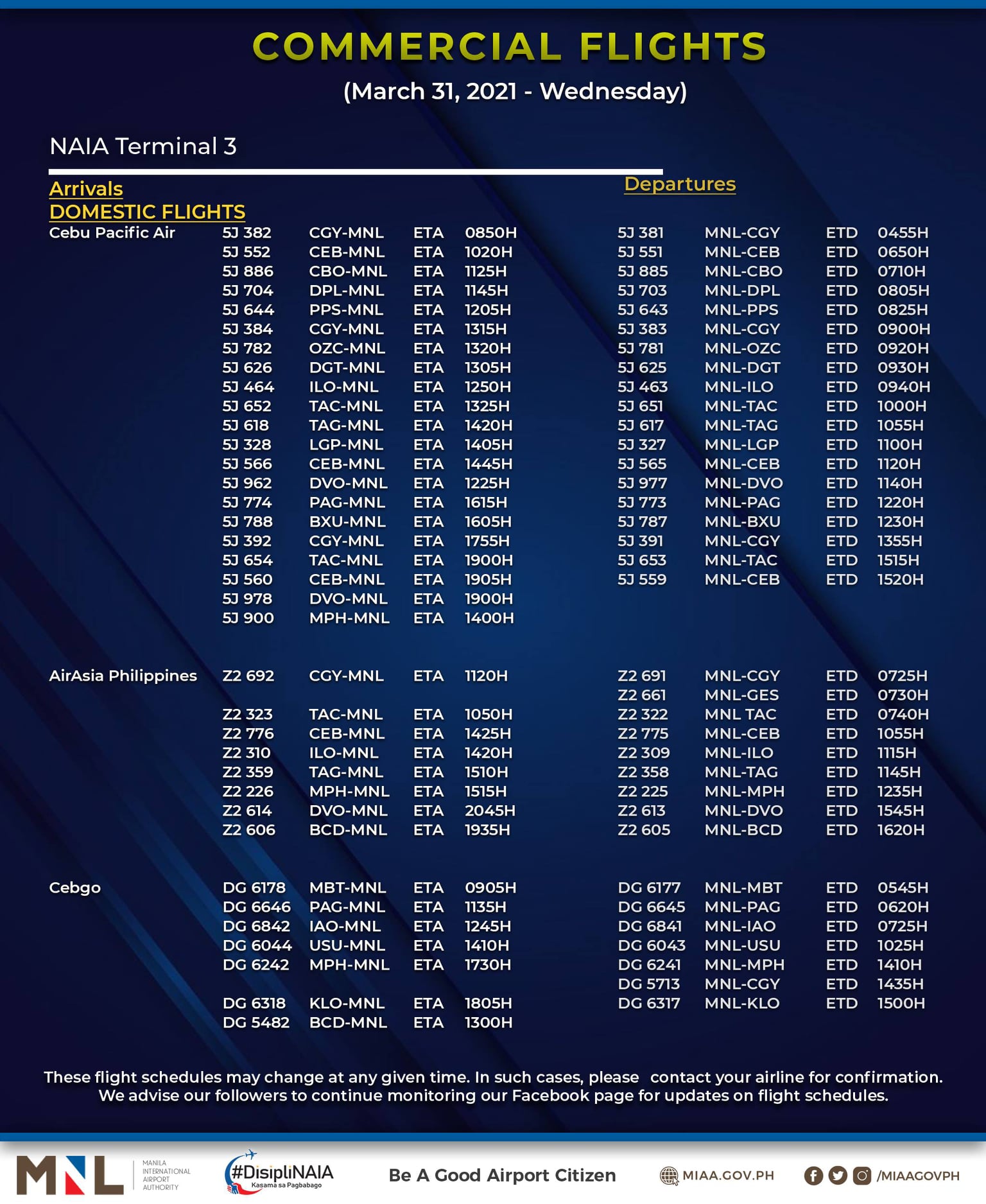 (Eagle News) — The Manila International Airport Authority has released its list of operational commercial flights for Wednesday, March 31: