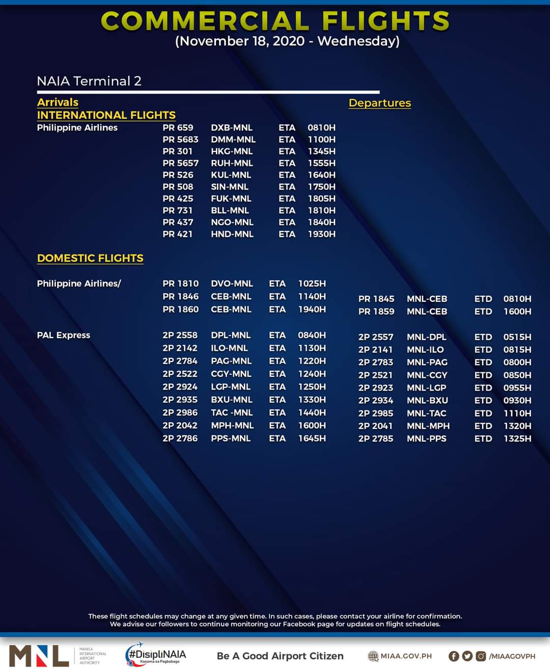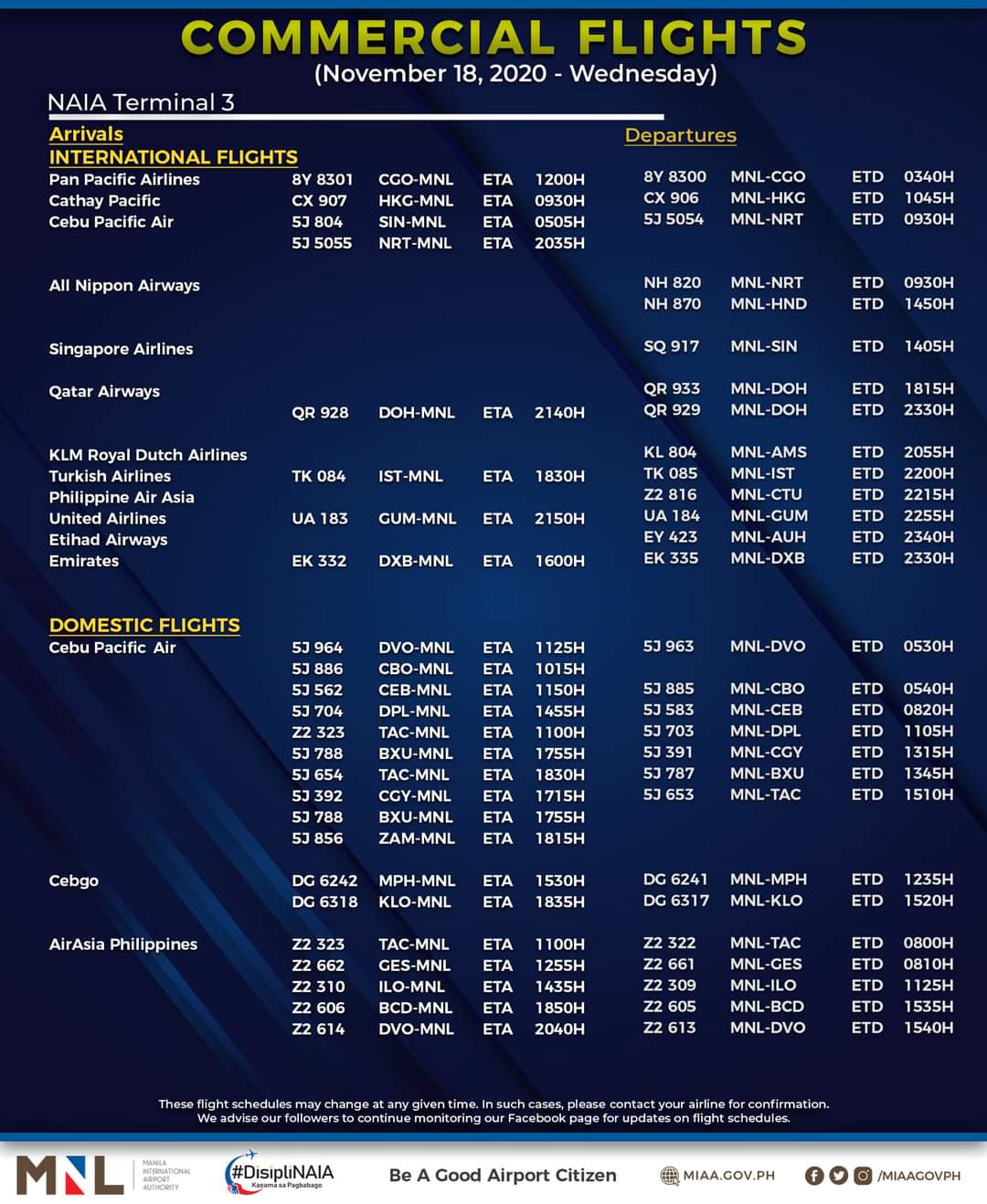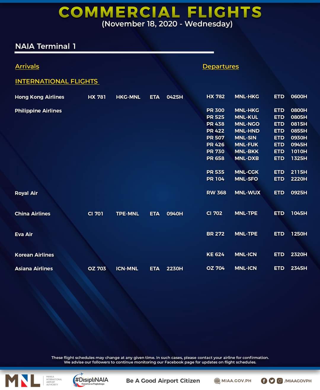 (Eagle News)–The Manila International Airport Authority has released its list of operational commercial flights for Wednesday, Nov. 18: