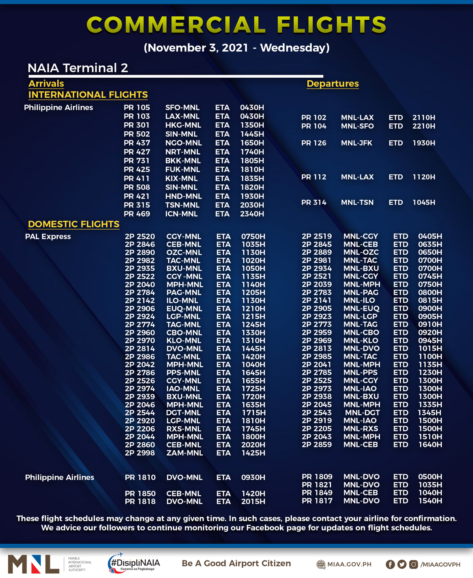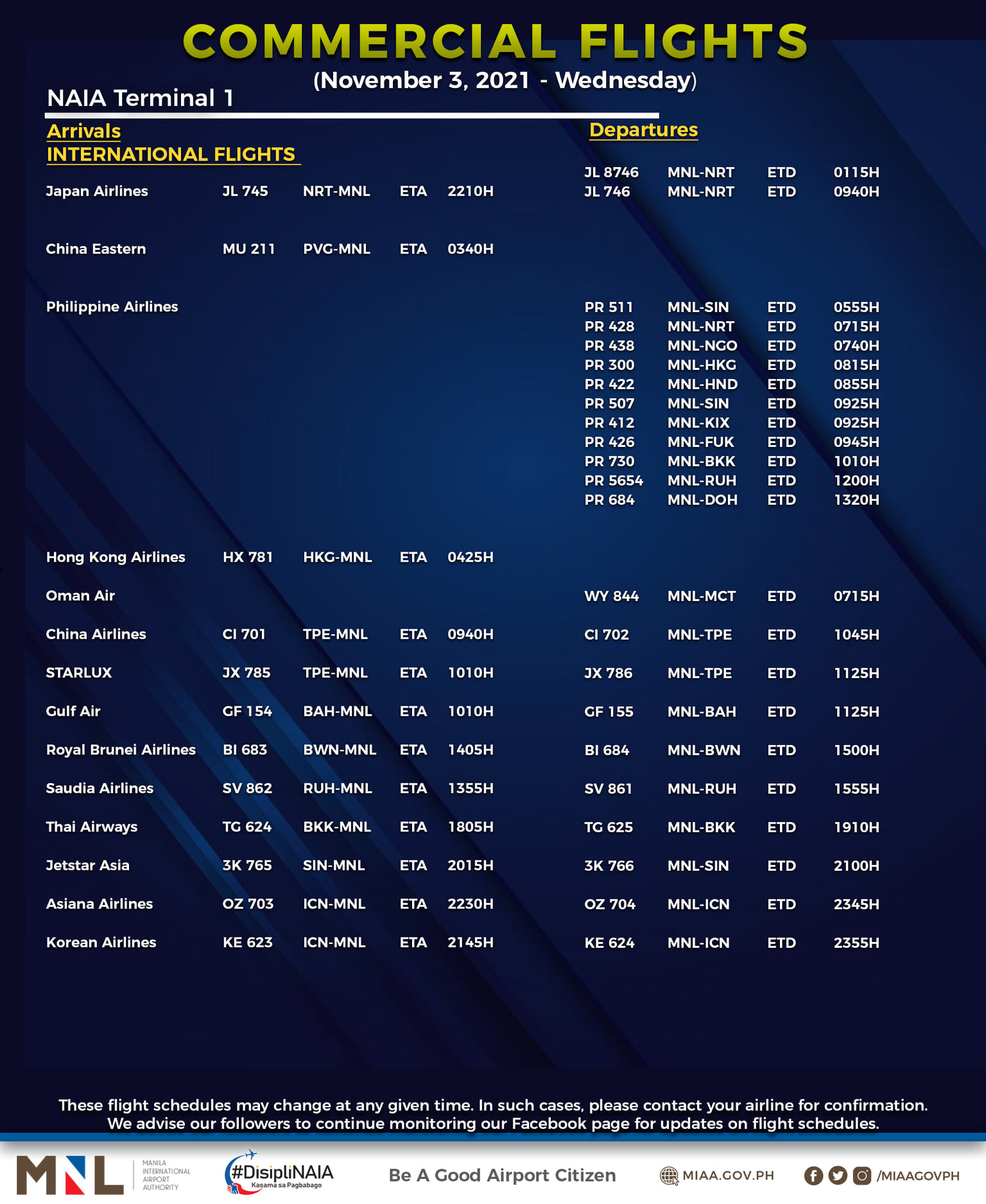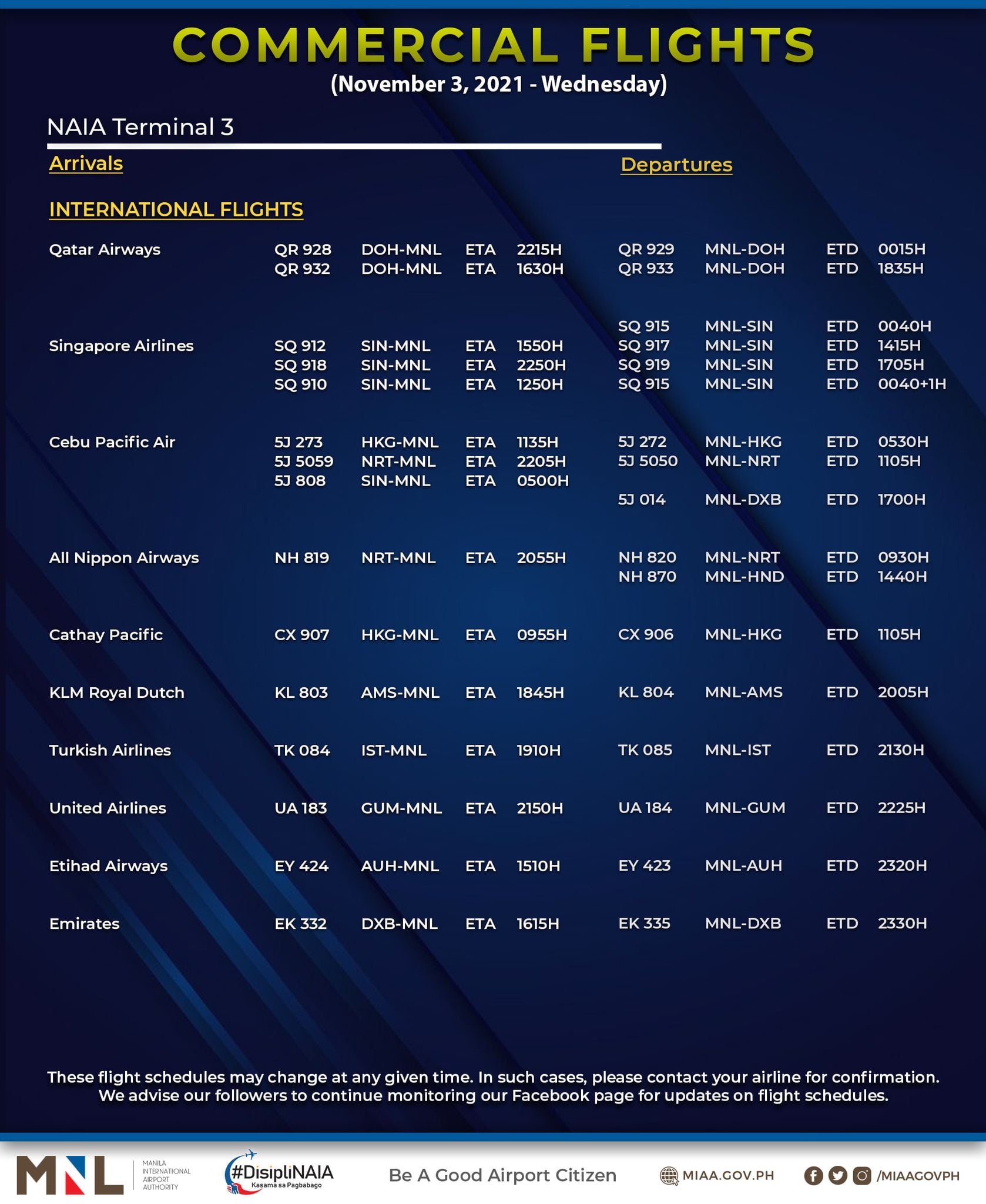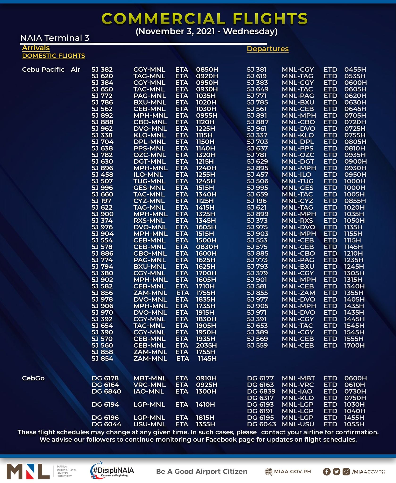 (Eagle News) — The Manila International Airport Authority has released its list of operational commercial flights for Wednesday, Nov. 3: