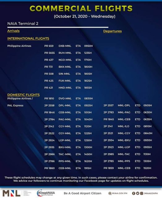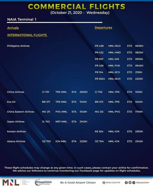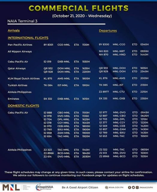 (Eagle News)–The Manila International Airport Authority has released its list of operational commercial flights for Wednesday, Oct. 21: