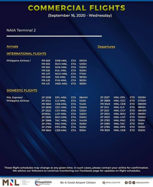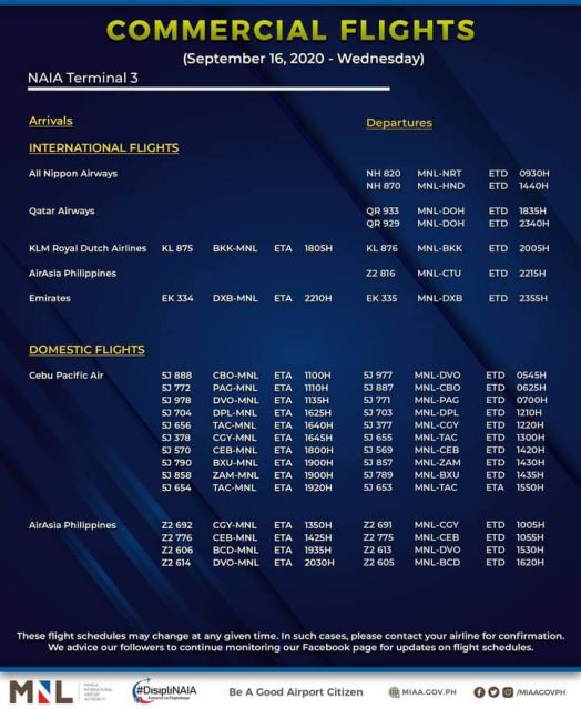 (Eagle News)–The Manila International Airport Authority has released its list of operational commercial flights for Wednesday, Sept. 16: