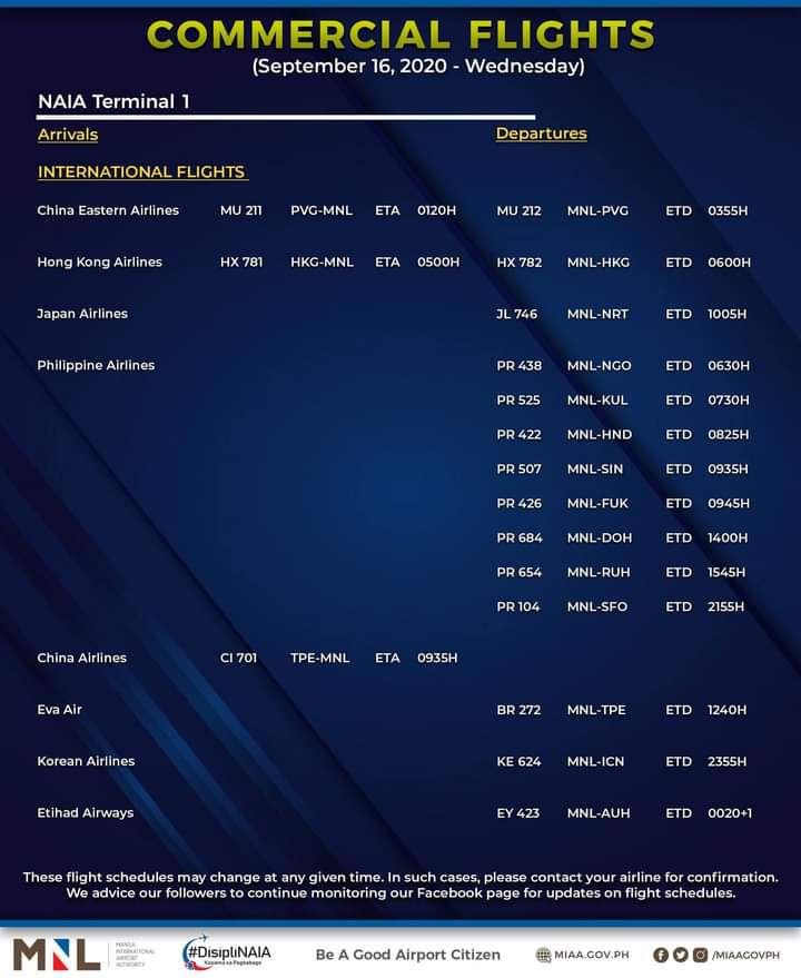 (Eagle News)–The Manila International Airport Authority has released its list of operational commercial flights for Wednesday, Sept. 16: