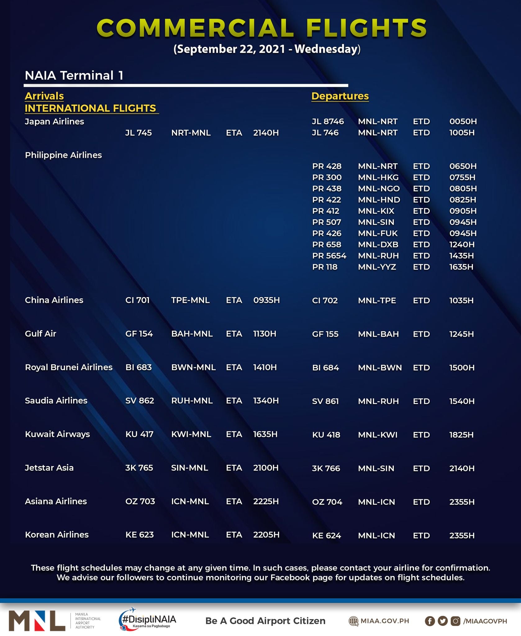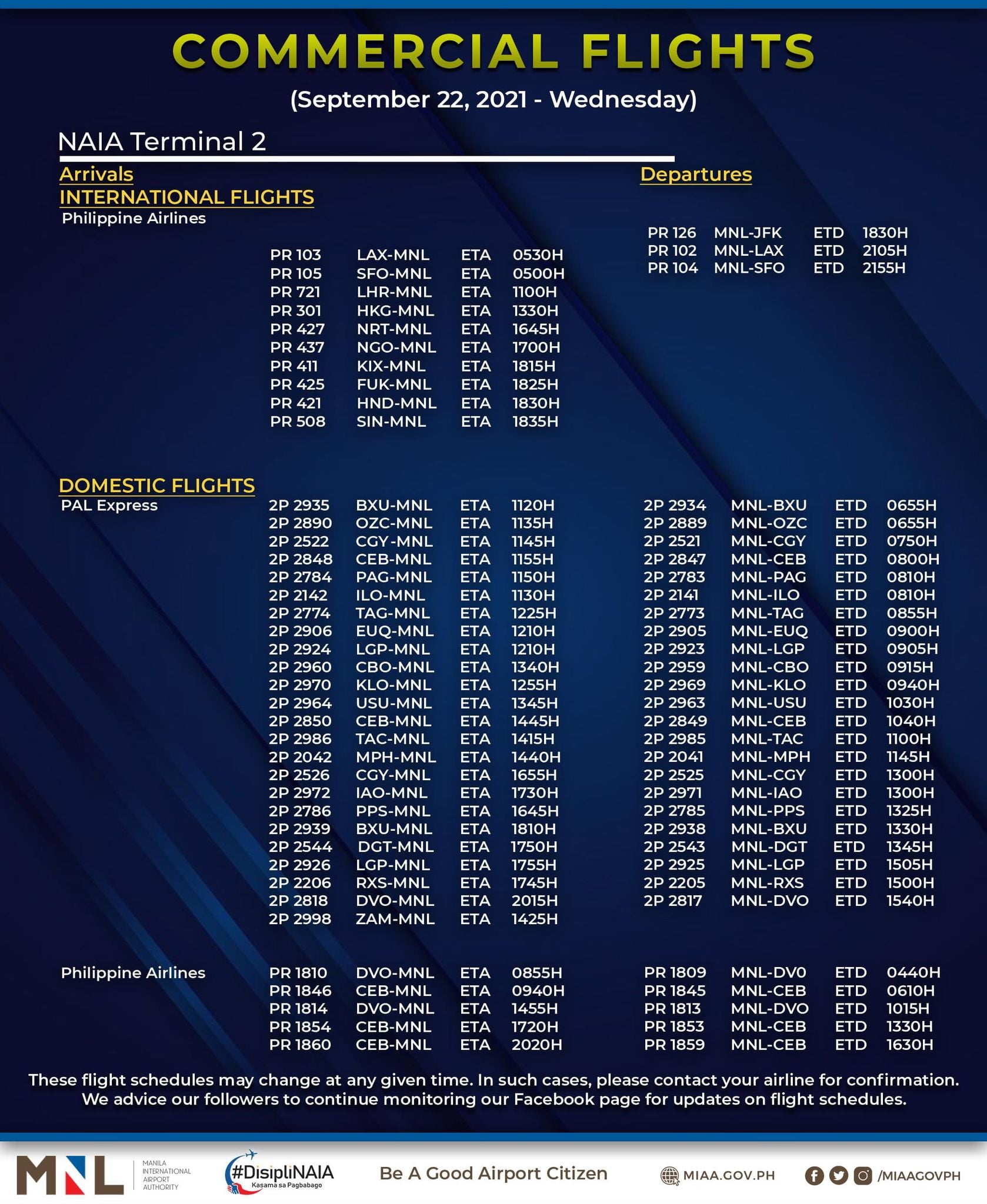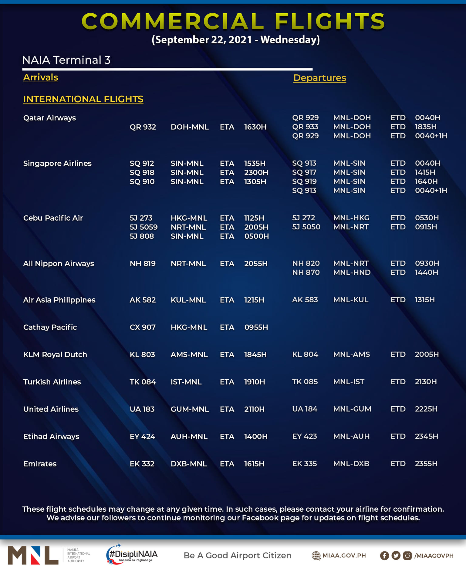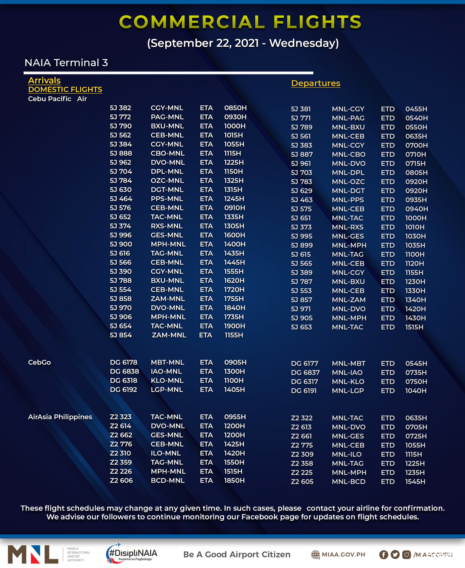 (Eagle News) — The Manila International Airport Authority has released its list of operational commercial flights for Wednesday, September 22:
