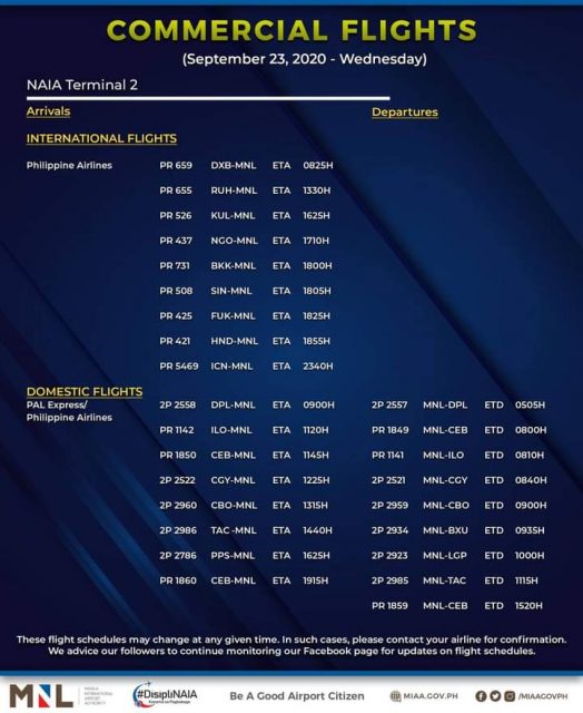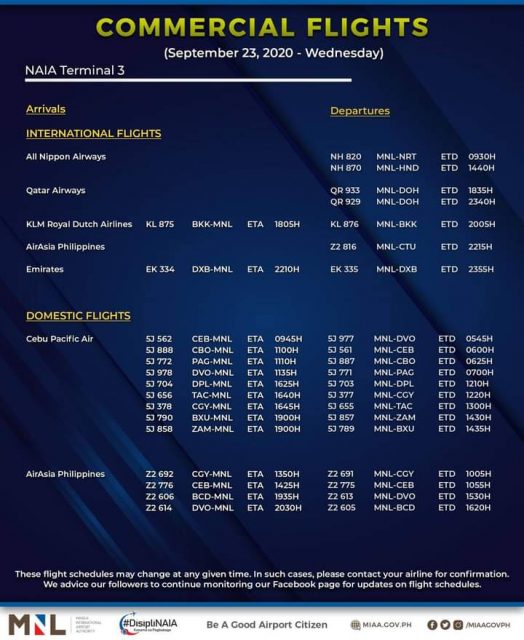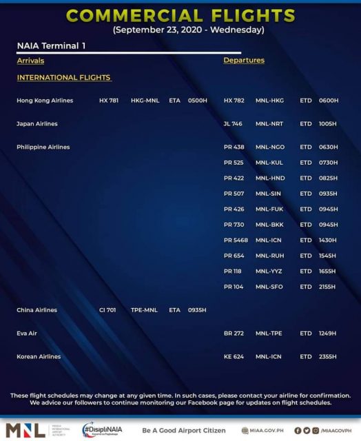 (Eagle News)–The Manila International Airport Authority has released its list of operational commercial flights for Wednesday, Sept. 23: