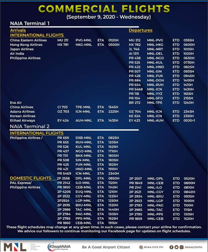 (Eagle News)–The Manila International Airport Authority has released its list of commercial flights for Wednesday, Sept. 9: