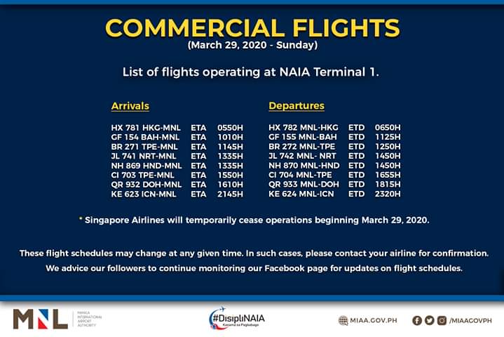 Earlier, MIAA said all flight operations will be concentrated at the Ninoy Aquino International Airport Terminal 1 in a bid to reduce the risk of exposure to the coronavirus disease 2019 of airport workers.