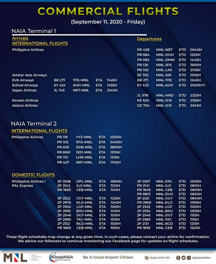 (Eagle News)–The Manila International Airport Authority has released its list of operational commercial flights for Friday, Sept. 11: