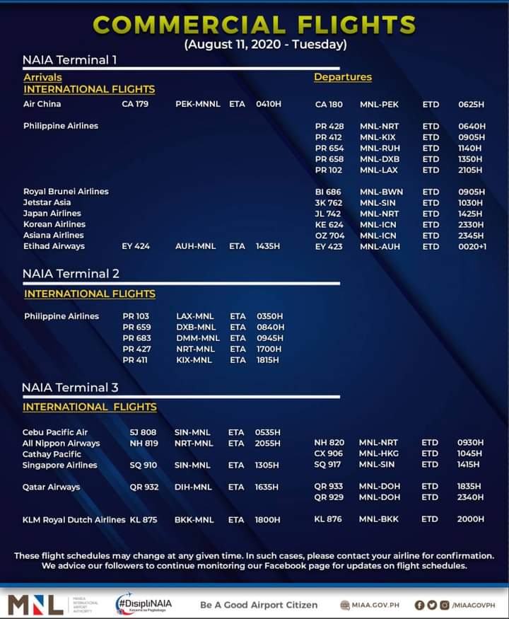 (Eagle News)–The Manila International Airport Authority has released its list of operational commercial flights for Tuesday, Aug. 11: