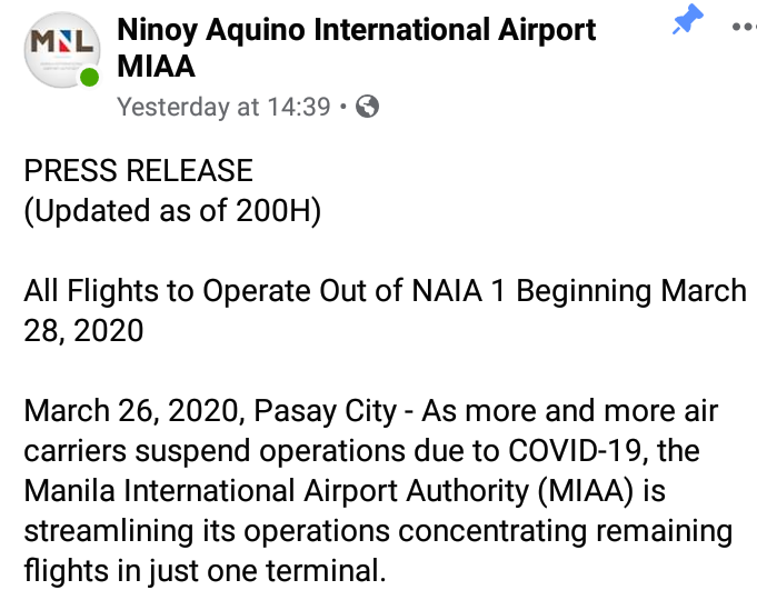The Manila International Airport Authority made the announcement of the concentration of its operations in the Ninoy Aquino International Airport Terminal 1, noting the suspension of operations of many air carriers due to the coronavirus disease 2019.