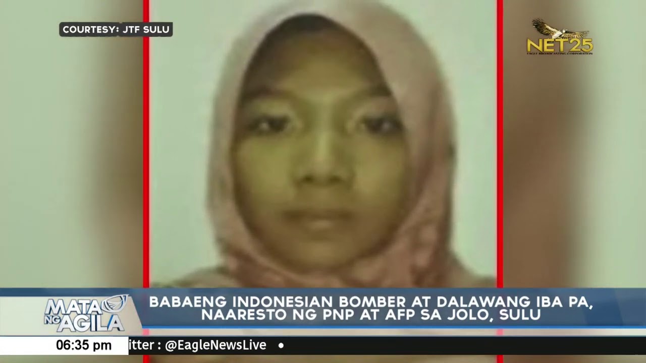 (Eagle News)–An Indonesian suicide bomber who was believed to be the daughter of the couple behind the Jolo blasts early last year, was arrested in Jolo, Sulu early Saturday, the military said.