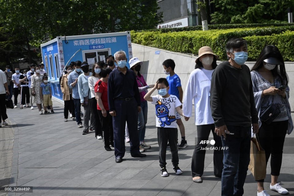 People queue to be tested for Covid-19 coronavirus outside a shopping mall in Beijing on May 5, 2022. (Photo by Jade GAO / AFP)