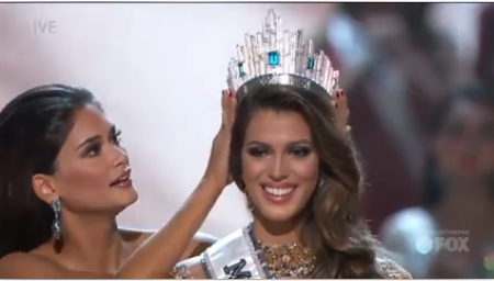 Her successor, Pia Wurtzbach, with a dazzling smile congratulated Miss France as she passed the most recent Miss Universe crown– Manhattan Skyline Crown.