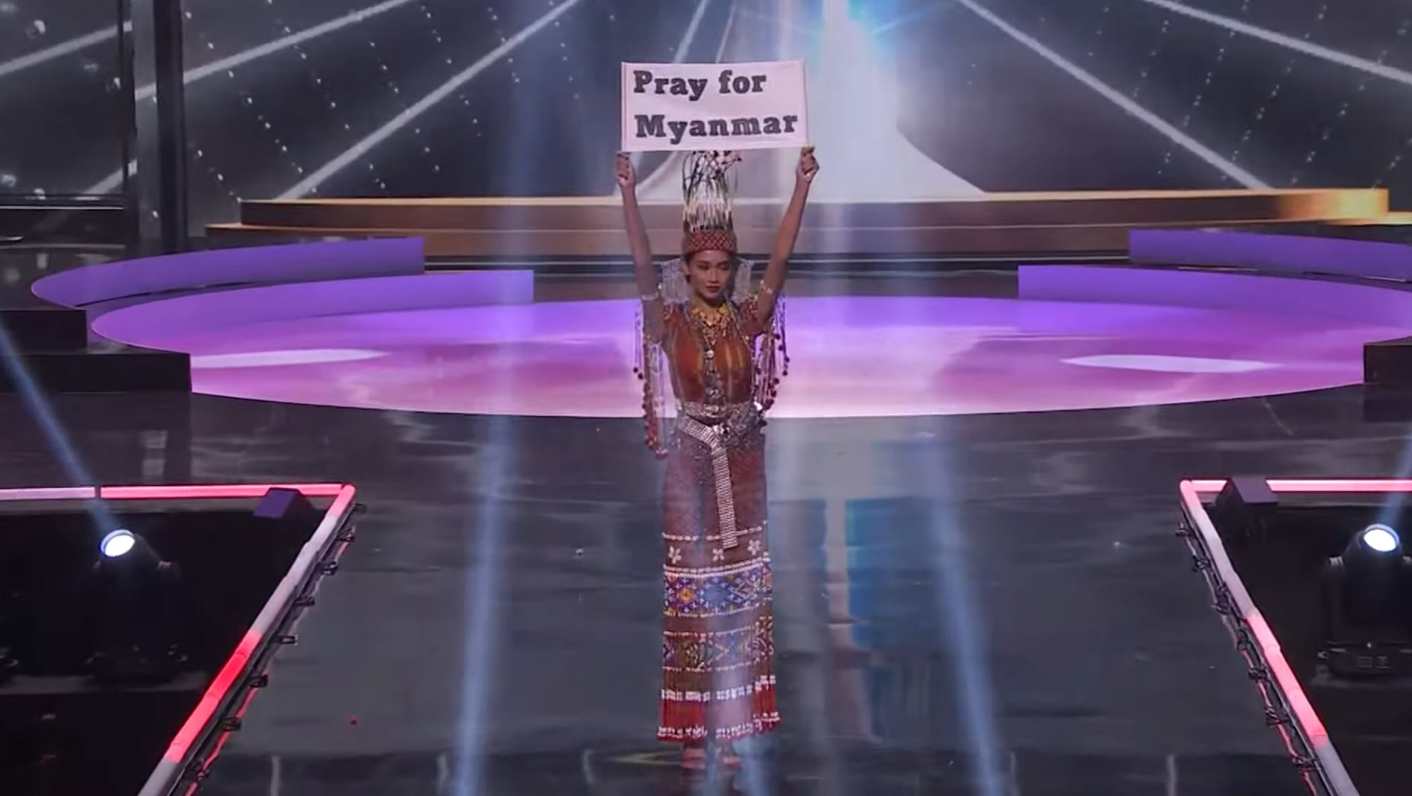 At the center of the stage, when all eyes were on her and on the national costume she wore, she raised a sign that read “Pray for Myanmar.”