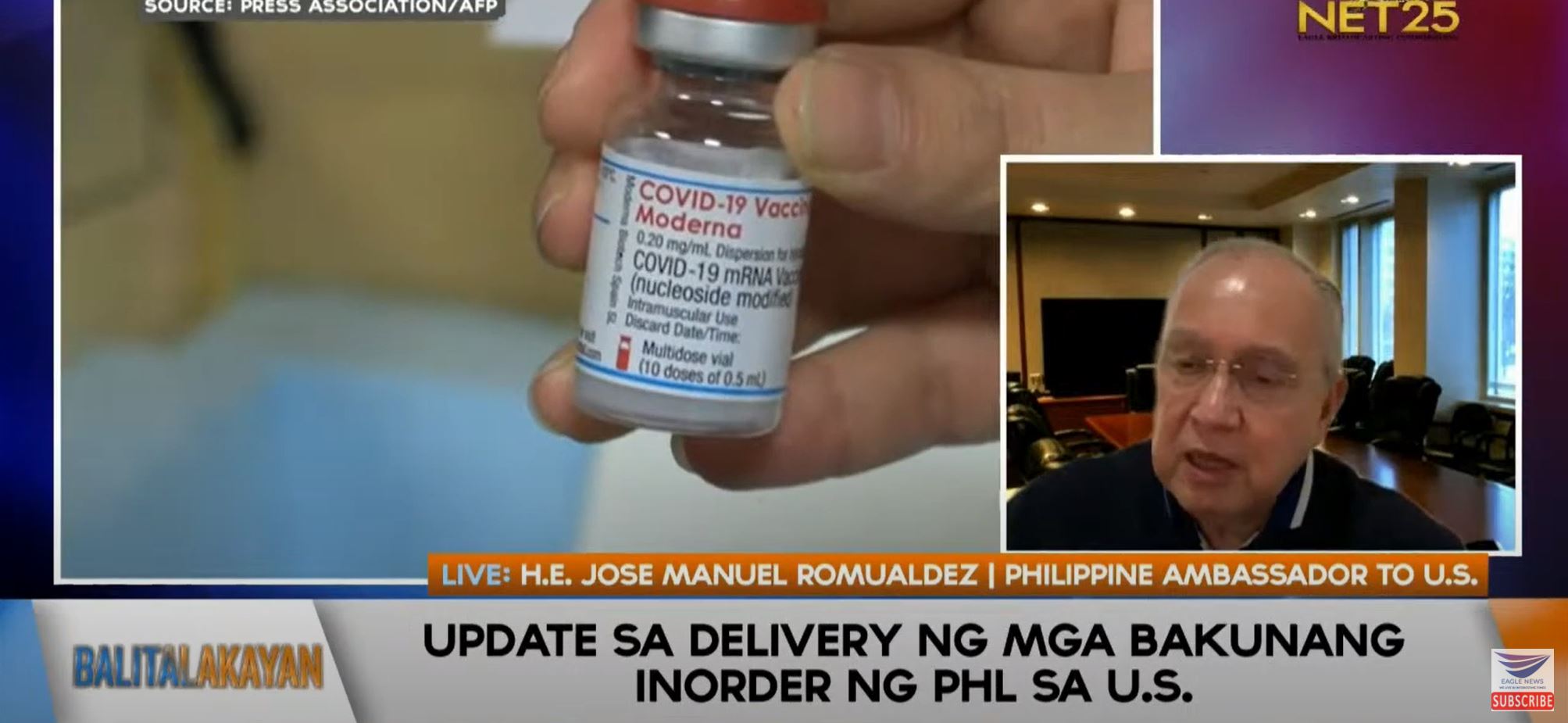 (Eagle News) — Moderna would start delivering its vaccines to the Philippines by June 15 by which time more vaccines coming from the United States, including those from Pfizer, would be also arriving, according to Philippine Ambassador to the United States Jose Manuel “Babe” Romualdez.