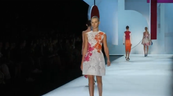 Lhuillier’s collection was filled with bold electric colors, which she called lipstick pink, strawberry reds and azure blue. The combination made the collection feel modern and new with a sophisticated edge.