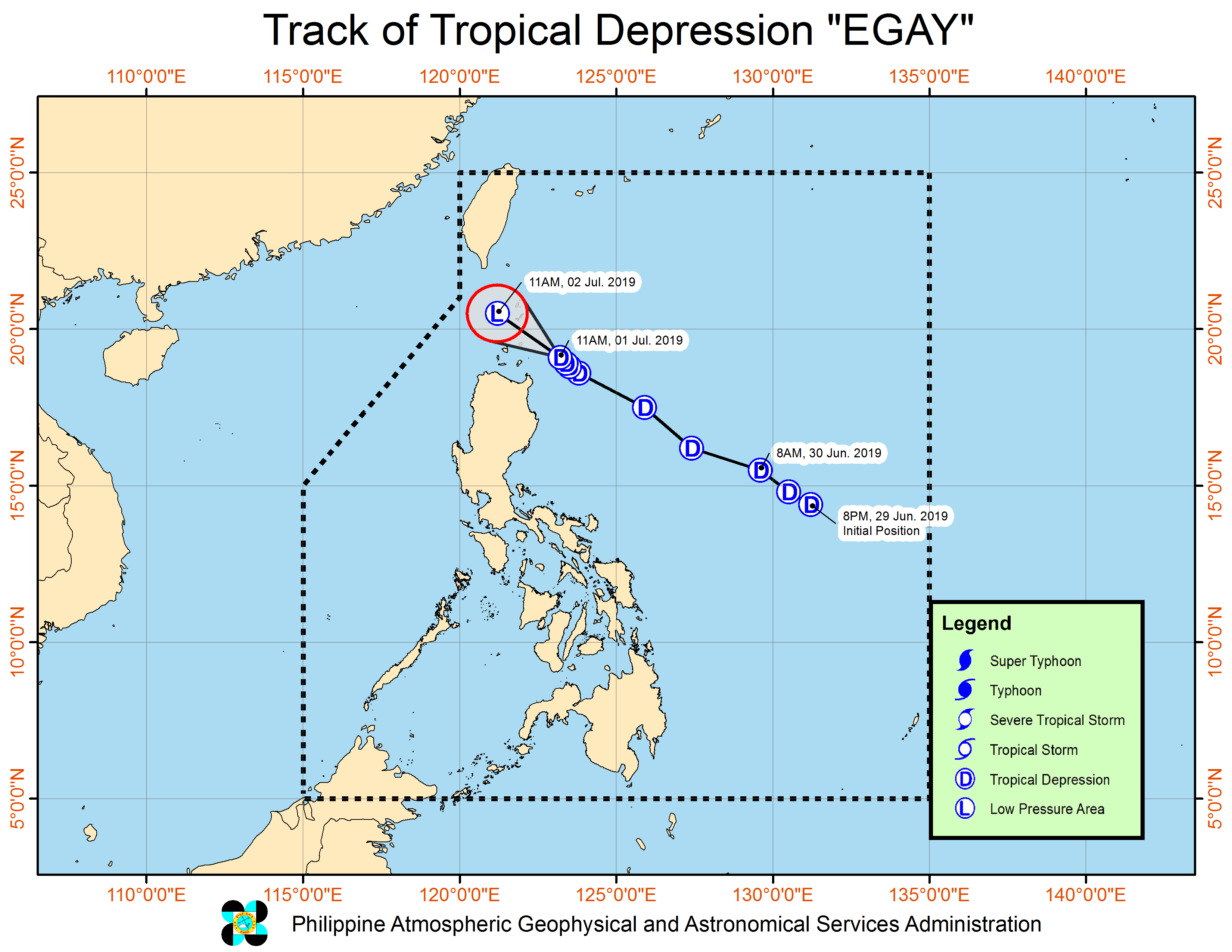 (Eagle News) – Tropical depression “Egay” remains almost stationary while over the Luzon Strait due east of Babuyan group of islands, and was spotted based at 175 kilometers east of Calayan, Cagayan as of 1 p.m.