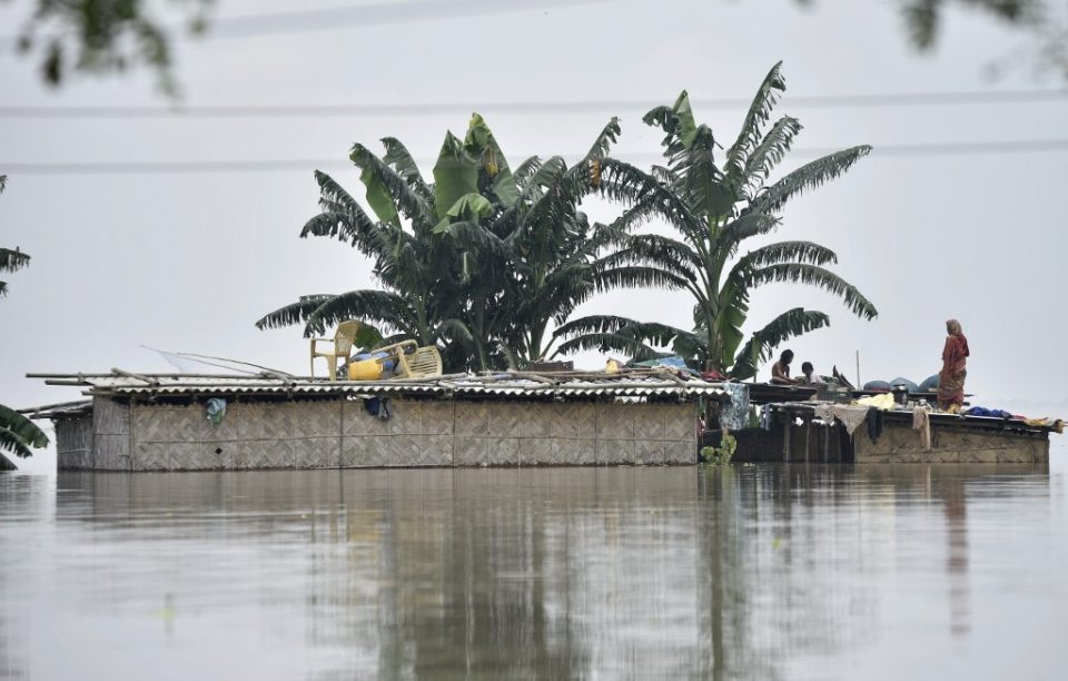 In this picture taken on July 16, 2019, members of an Indian family stand atop a hut at the flood affected area of Hatishila, in Kamrup district of Assam state. – Survivors scrambled for higher ground as torrential monsoon rains swept away homes and triggered landslides across South Asia on July 16, with millions of people affected and at least 180 dead, officials said. (Photo by Biju BORO / AFP)