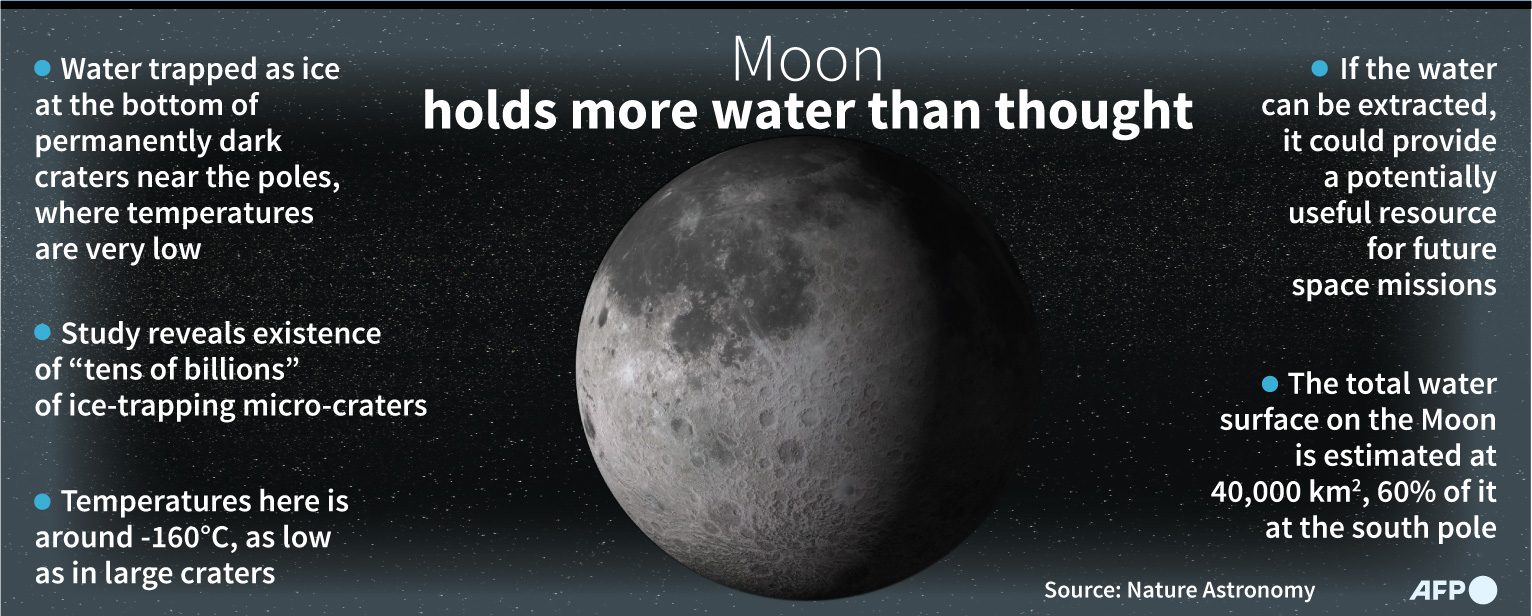 PARIS, France (AFP) — There may be far more water on the Moon than previously thought, according to two studies published Monday raising the tantalizing prospect that astronauts on future space missions could find refreshment — and maybe even fuel — on the lunar surface.