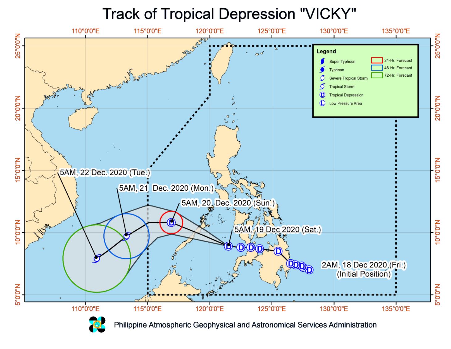 TD VICKY is forecast to remain a tropical depression while crossing the Philippine archipelago. However, once it reaches the West Philippine Sea, it is forecast to intensify into a tropical storm.