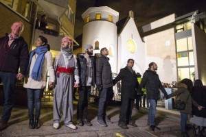 Muslims join hands to form a human shield as they stand outside a synagogue in Oslo February 21, 2015. REUTERS/Hakon Mosvold Larsen/NTB Scanpix