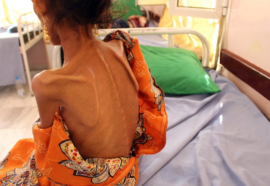 Fatima Hadi, a 12-year-old displaced Yemeni girl suffering from acute malnutrition, lies on a bed at a hospital in Yemen’s northwestern Hajjah province, on February 25, 2019. – The UN said today it had reached food aid warehouses on the frontlines in Yemen, holding enough supplies to feed millions of people, for the first time since September. (Photo by ESSA AHMED / AFP)