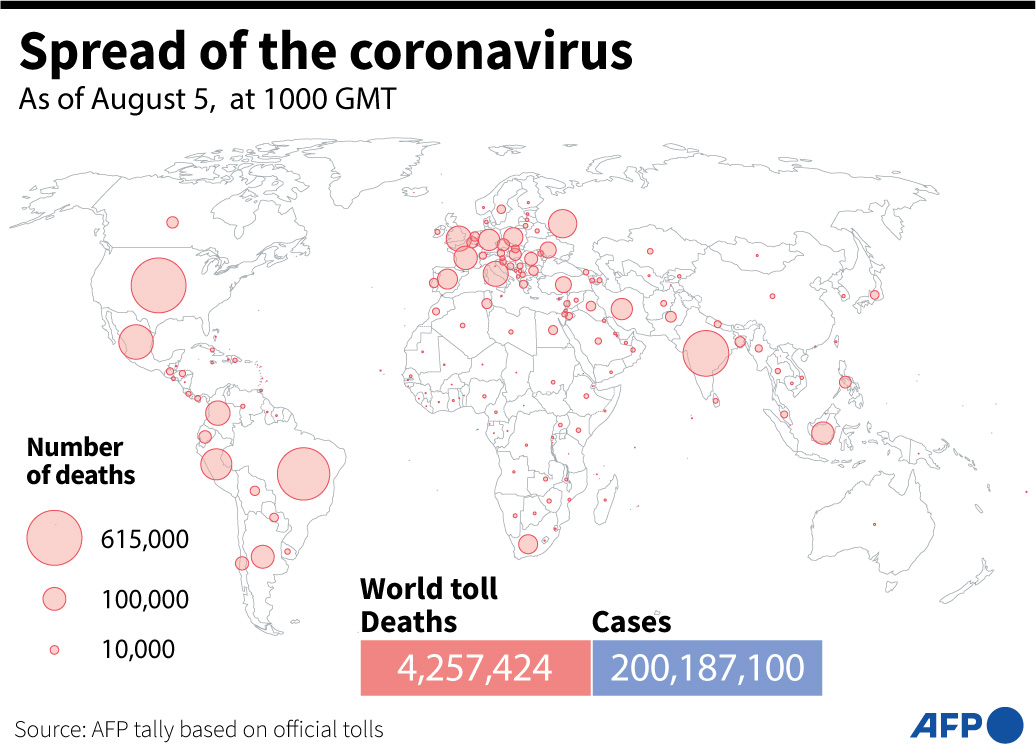 PARIS, France (AFP) — More than 200 million cases of Covid-19 cases have now been registered worldwide since the novel coronavirus emerged in China in December 2019, according to a tally from official sources compiled by AFP at 0700 GMT on Thursday.