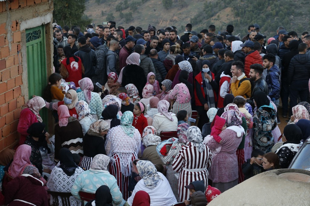 People gather as Moroccan civil defense members (unseen) work to rescue five-year-old child Rayan trapped in a deep well for over two days in the northern province of Chefchaouen near Bab Berred on February 3, 2022. (Photo by AFP)