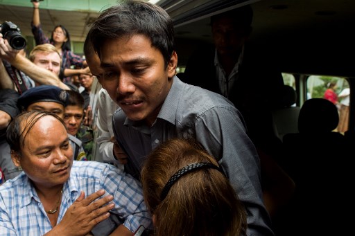 Two Myanmar journalists working for international newswire Reuters, held incommunicado since their arrest, appeared in court for the first time as their two-week remand period ended. / AFP PHOTO / YE AUNG THU