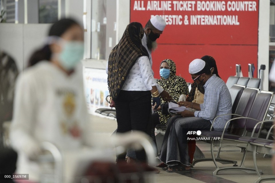 (FILE) Myanmar nationals wait before checking-in for a special flight to Yangon at Anna International Airport in Chennai on May 24, 2020. (Photo by Arun SANKAR / AFP)