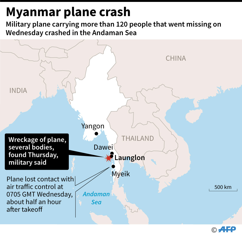 YANGON, Myanmar (AFP) — Myanmar’s military said Thursday it has found the wreckage of a plane in the Andaman Sea that went missing with around 120 people on board, along with several bodies.