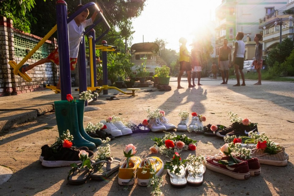 This photo taken and received courtesy of an anonymous source on April 8, 2021 shows a child playing near shoes displayed with flowers in Yangon’s Insein township, as part of the “Marching Shoes Strike” called on social media to protest against the demonstration against the military coup in Myanmar. (Photo by Handout / ANONYMOUS / AFP)