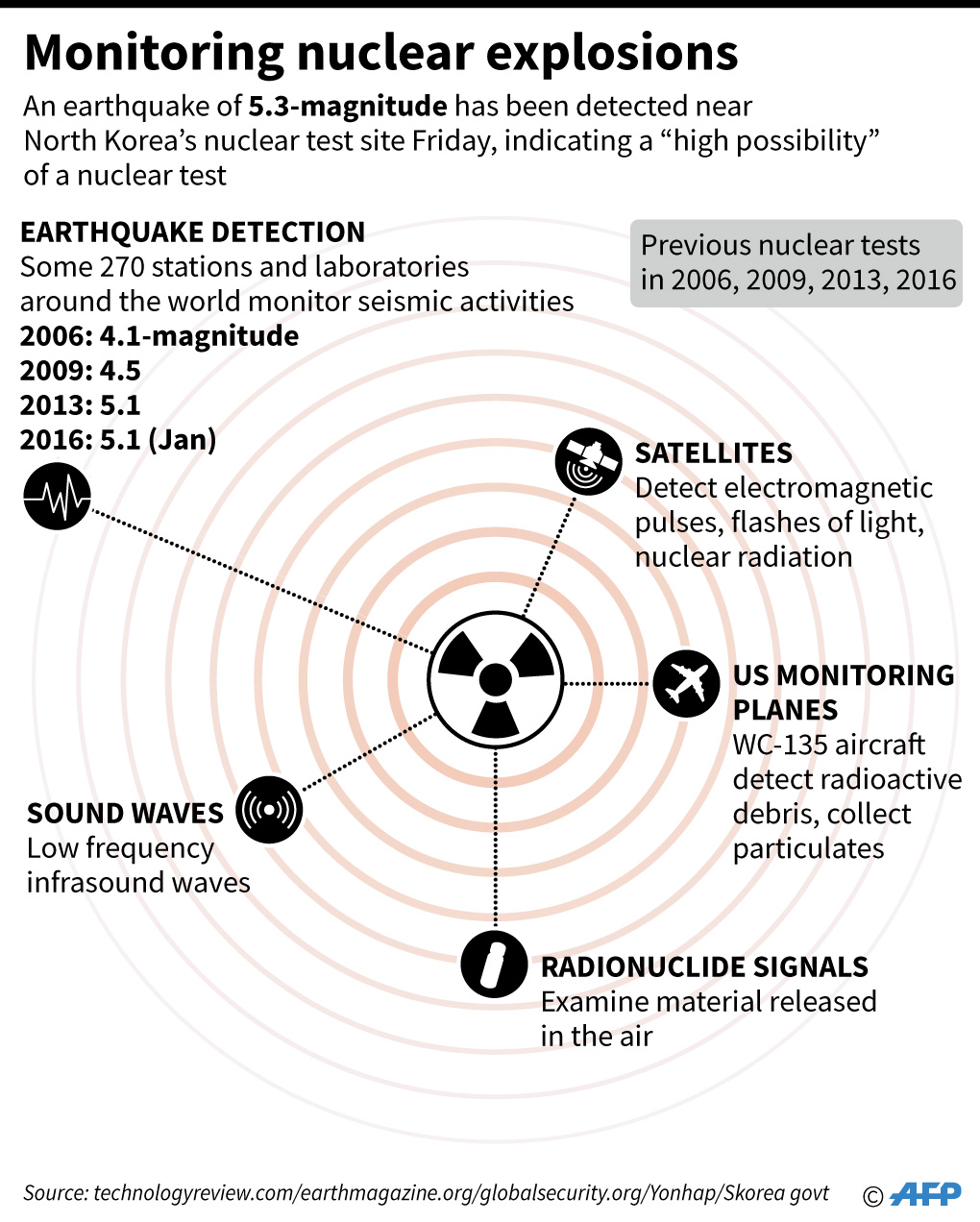 SEOUL, South Korea (AFP) — North Korea appears to have conducted a fifth nuclear test Friday, South Korean authorities reportedly said, after monitors detected a 5.3-magnitude earthquake near its main nuclear site.