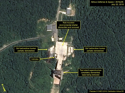 North Korea appears to have started dismantling key facilities at a rocket-engine test center, a group of experts said, potentially marking a significant step after last month’s summit between Kim Jong Un and President Donald Trump. / AFP PHOTO
