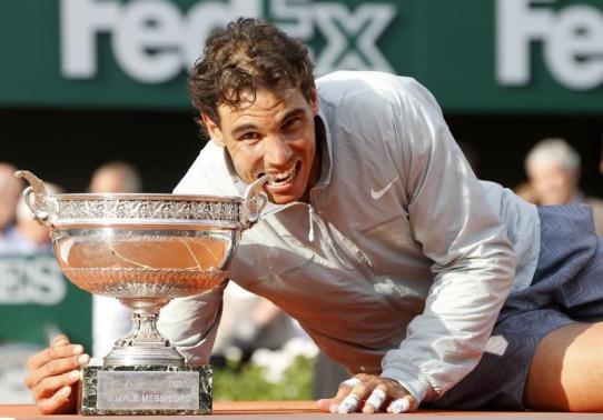 Rafael Nadal of Spain bites the trophy as he poses during the ceremony after defeating Novak Djokovic of Serbia during their men’s singles final match to win the French Open Tennis tournament at the Roland Garros stadium in Paris June 8, 2014. REUTERS/Jean-Paul Pelissier