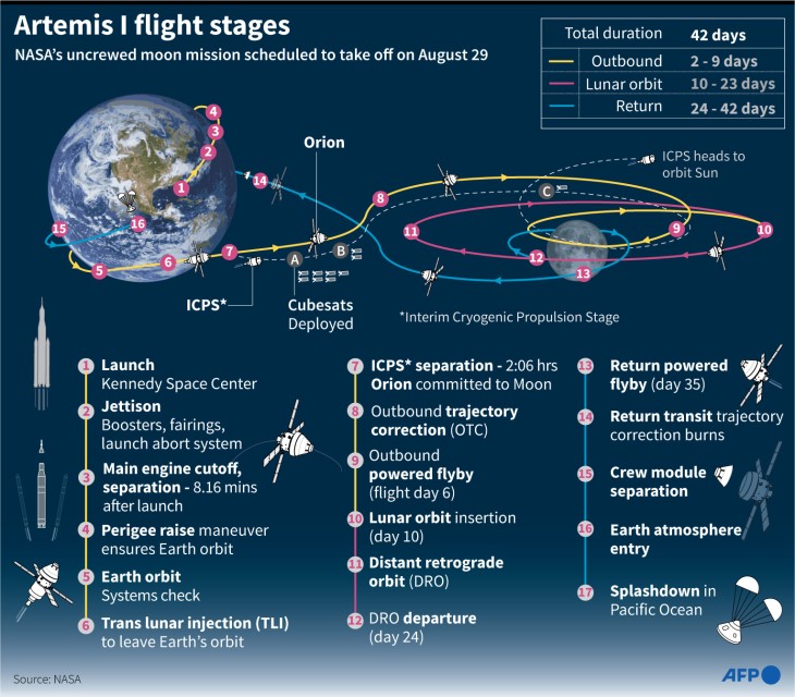 UNITED STATES (AFP) — NASA’s most powerful rocket yet is set to blast off Monday on the maiden voyage of a mission to take humans back to the Moon, and eventually to Mars.