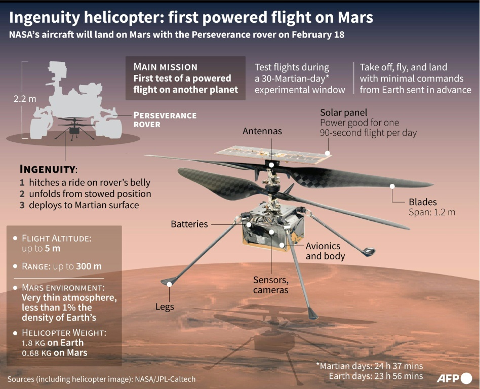 Transported aboard the Mars 2020 spacecraft that arrives at the Red Planet on Thursday, the small Ingenuity helicopter will have several challenges to overcome — the biggest being the rarefied Martian atmosphere, which is just one percent the density of Earth’s.