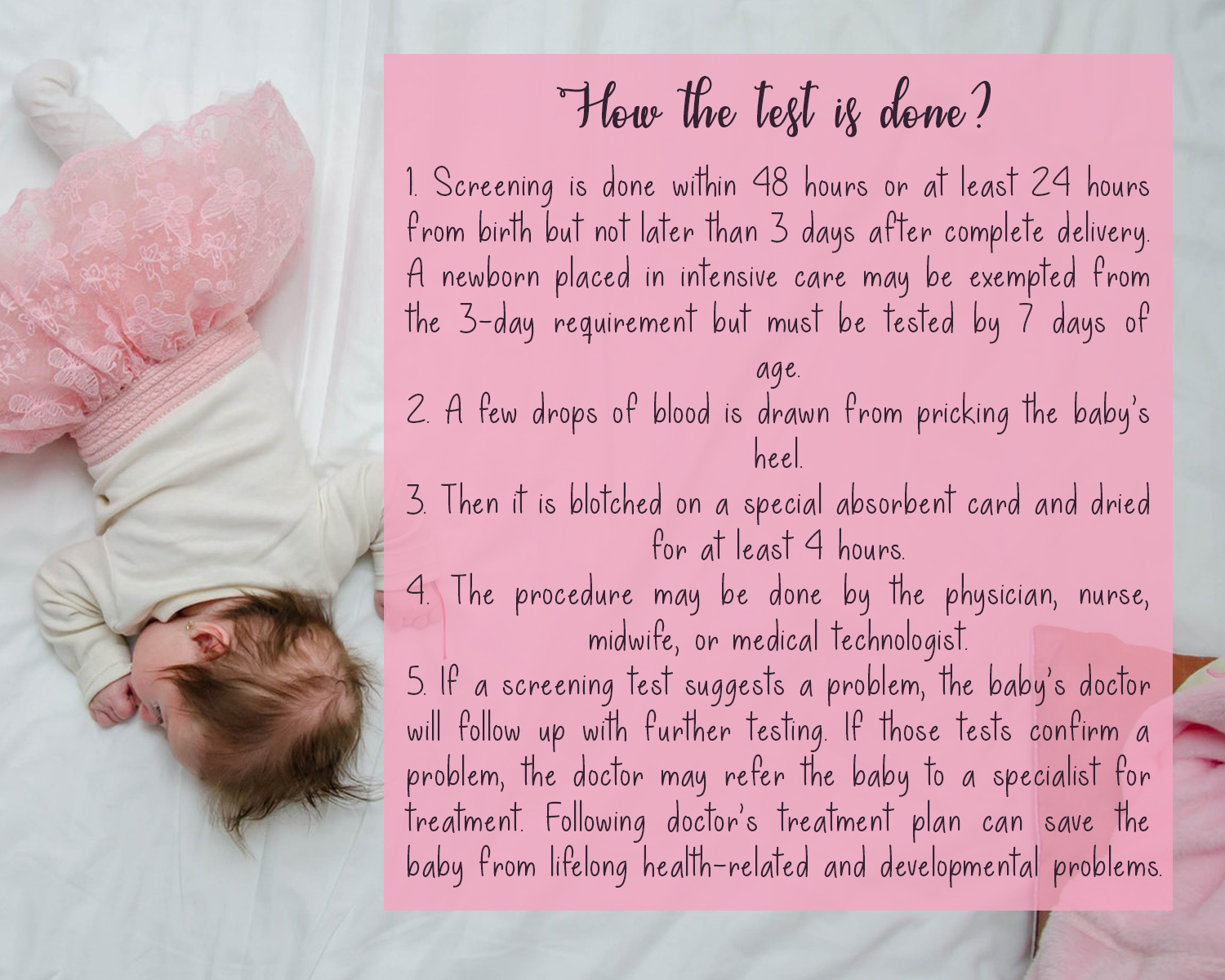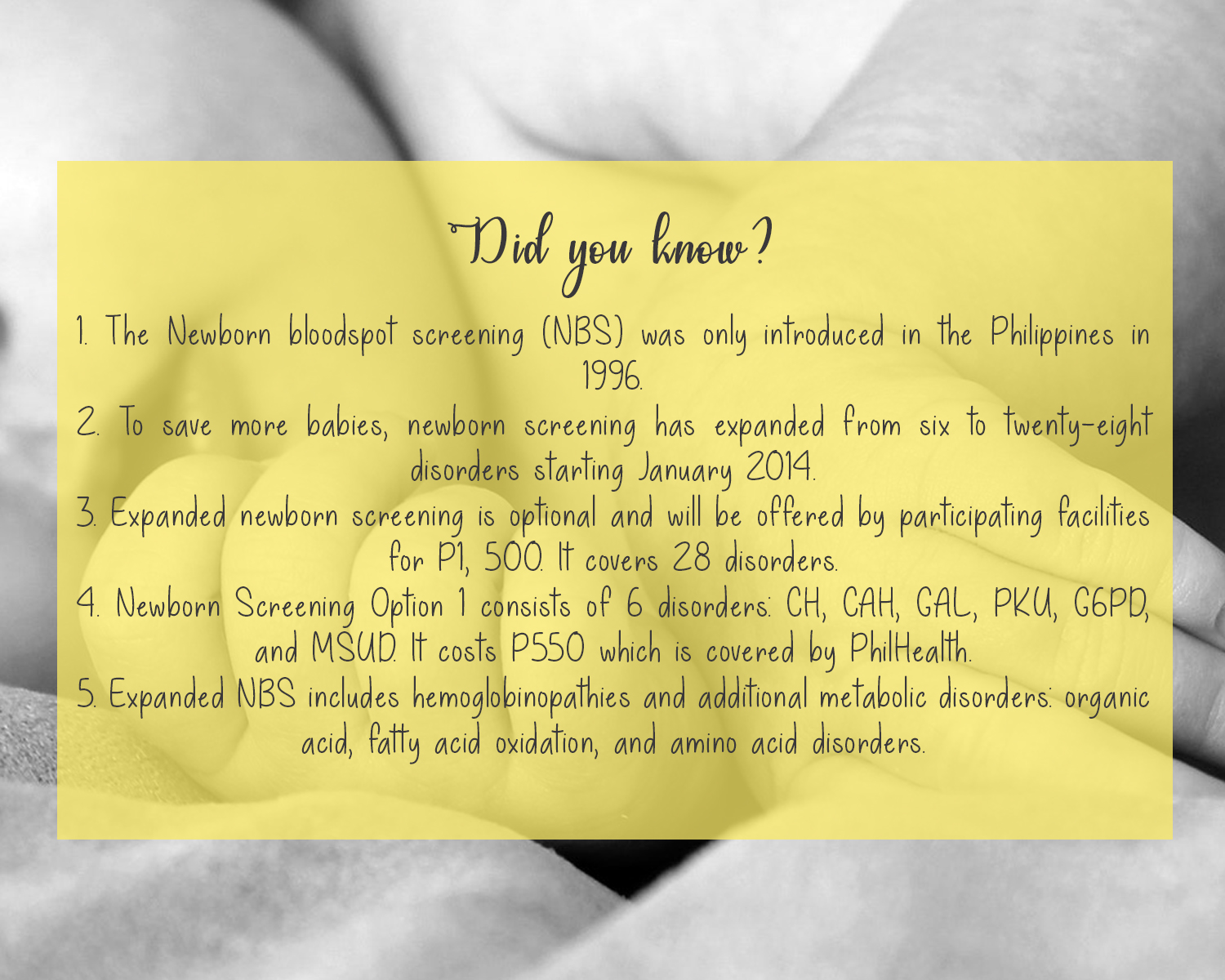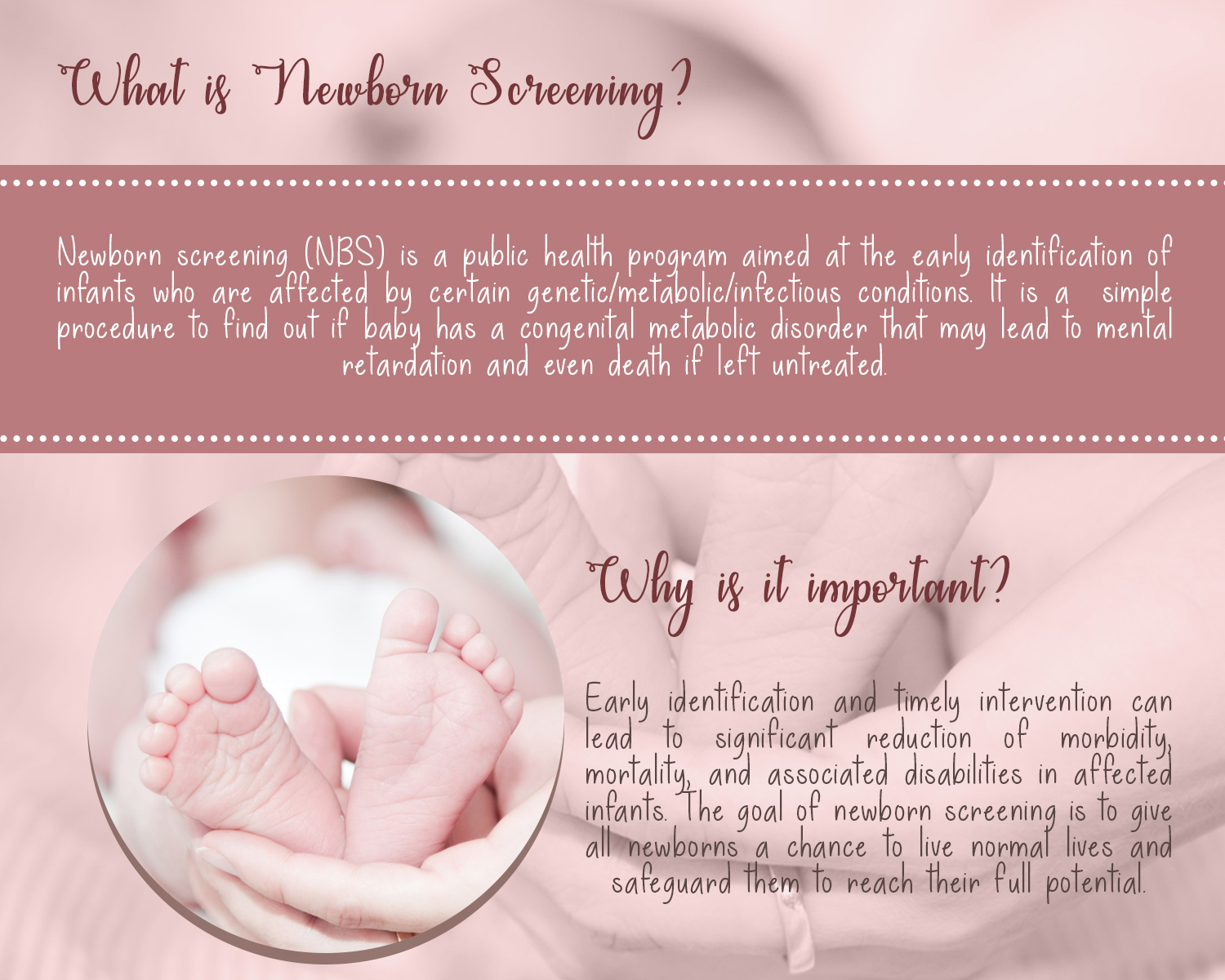 According to the Department of Health, newborn screening (NBS) is a public health program aimed at the early identification of infants who are affected by certain genetic/metabolic/infectious conditions. It is a simple procedure to find out if the baby has a congenital metabolic disorder that may lead to mental retardation and even death if left untreated.