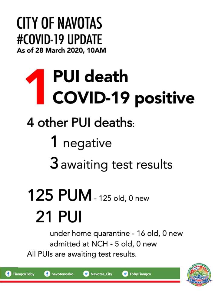 (Eagle News)–Navotas has confirmed its first coronavirus disease 2019 case, also its first death from the disease.