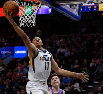 Dante Exum (#11) of the Utah Jazz scores in front of Dane Pineau (#22) of the Sydney Kings in the first half of their pre-season game at Vivint Smart Home Arena on October 2, 2017 in Salt Lake City, Utah.  Gene Sweeney Jr./Getty Images/AFP