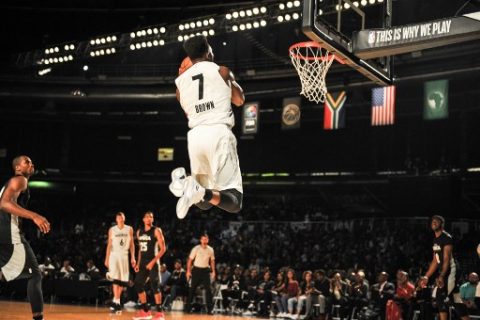 NBA player Jaylen Brown from the Boston Celtics jumps during the NBA Africa Game 2017 basketball match between Team Africa and Team World on August 5, 2017 in Johannesburg. / AFP PHOTO / MUJAHID SAFODIEN