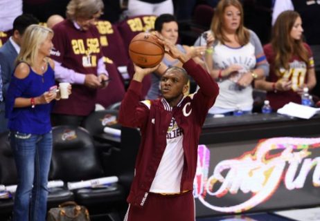 James Jones (#1) of the Cleveland Cavaliers warms up prior to Game Four of the 2015 NBA Finals against the Golden State Warriors at Quicken Loans Arena on June 11, 2015 in Cleveland, Ohio. Jason Miller/Getty Images/AFP