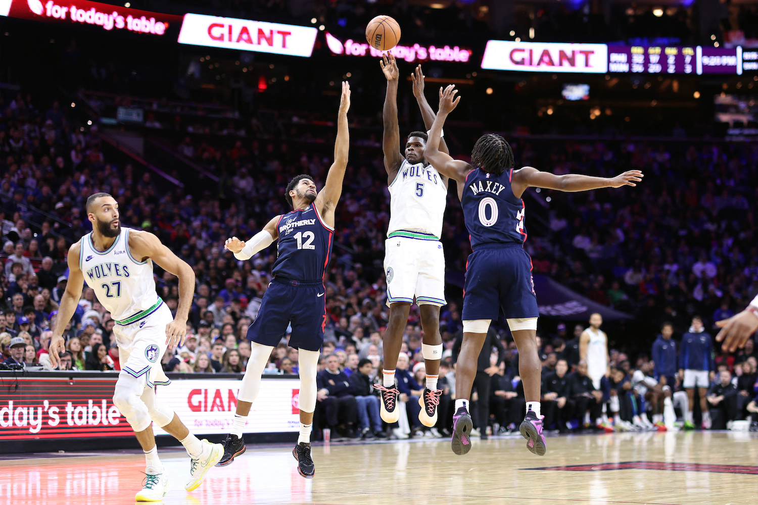 PHILADELPHIA, PENNSYLVANIA – DECEMBER 20: Anthony Edwards #5 of the Minnesota Timberwolves shoots between Tobias Harris #12 and Tyrese Maxey #0 of the Philadelphia 76ers during the fourth quarter at the Wells Fargo Center on December 20, 2023 in Philadelphia, Pennsylvania.  (Photo by Tim Nwachukwu / GETTY IMAGES NORTH AMERICA / Getty Images via AFP)