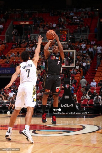 MIAMI, FL – DECEMBER 21: Kyle Lowry #7 of the Miami Heat shoots a three point basket during the game against the Indiana Pacers on December 21, 2021 at FTX Arena in Miami, Florida. (Photo by Issac Baldizon / NBAE / Getty Images / Getty Images via AFP)
