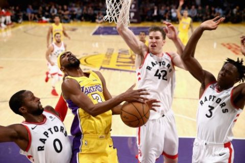LOS ANGELES, CA – OCTOBER 27: Corey Brewer #3 of the Los Angeles Lakers battles CJ Miles #0, OG Anunoby #3 and Jakob Poeltl #42 of the Toronto Raptors for a rebound during the first half of a game at Staples Center on October 27, 2017 in Los Angeles, California.  Sean M. Haffey/Getty Images/AFP
