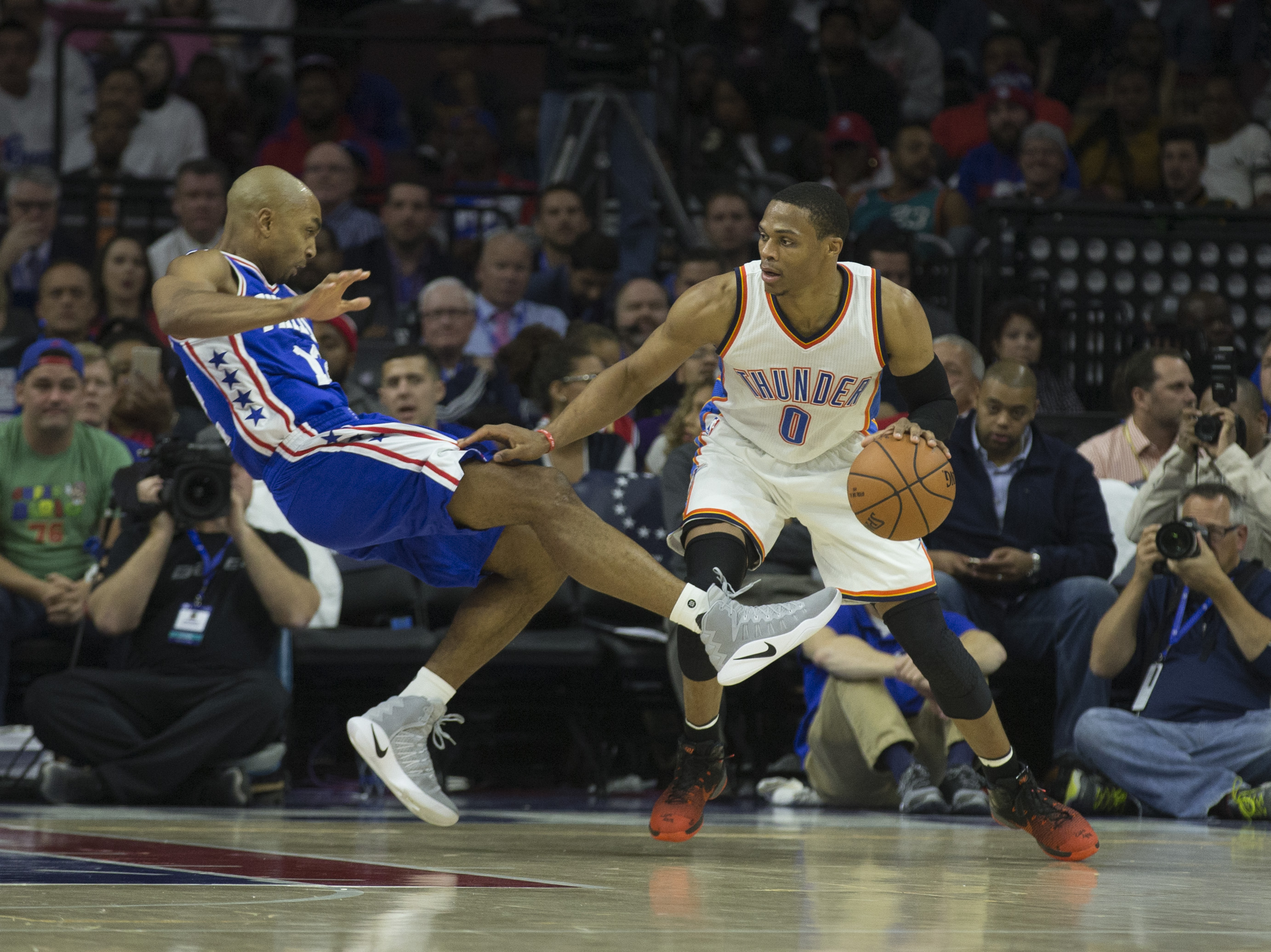 Westbrook, who also had 12 rebounds and nine assists, snapped a 97-97 tie with 35 seconds remaining by connecting twice from the free-throw line after a foul off the ball by Philadelphia’s Gerald Henderson.