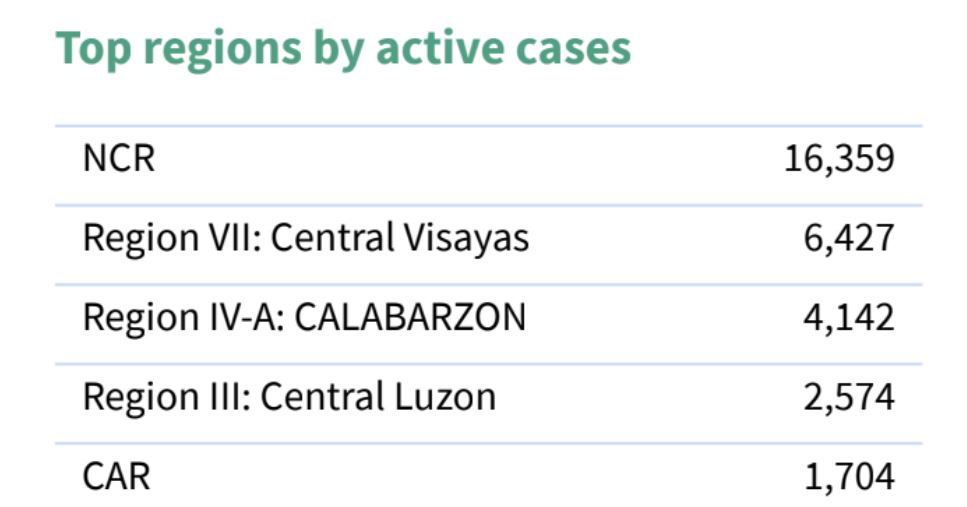 Metro Manila has 16,359 active cases as of March 8, followed by Central Visayas with 6,427 active cases; Region 4-A or CALABARZON with 4,142 active cases; Central Luzon with 2,574 cases; and Cordillera Administrative Region comprising the top five regions with active cases.