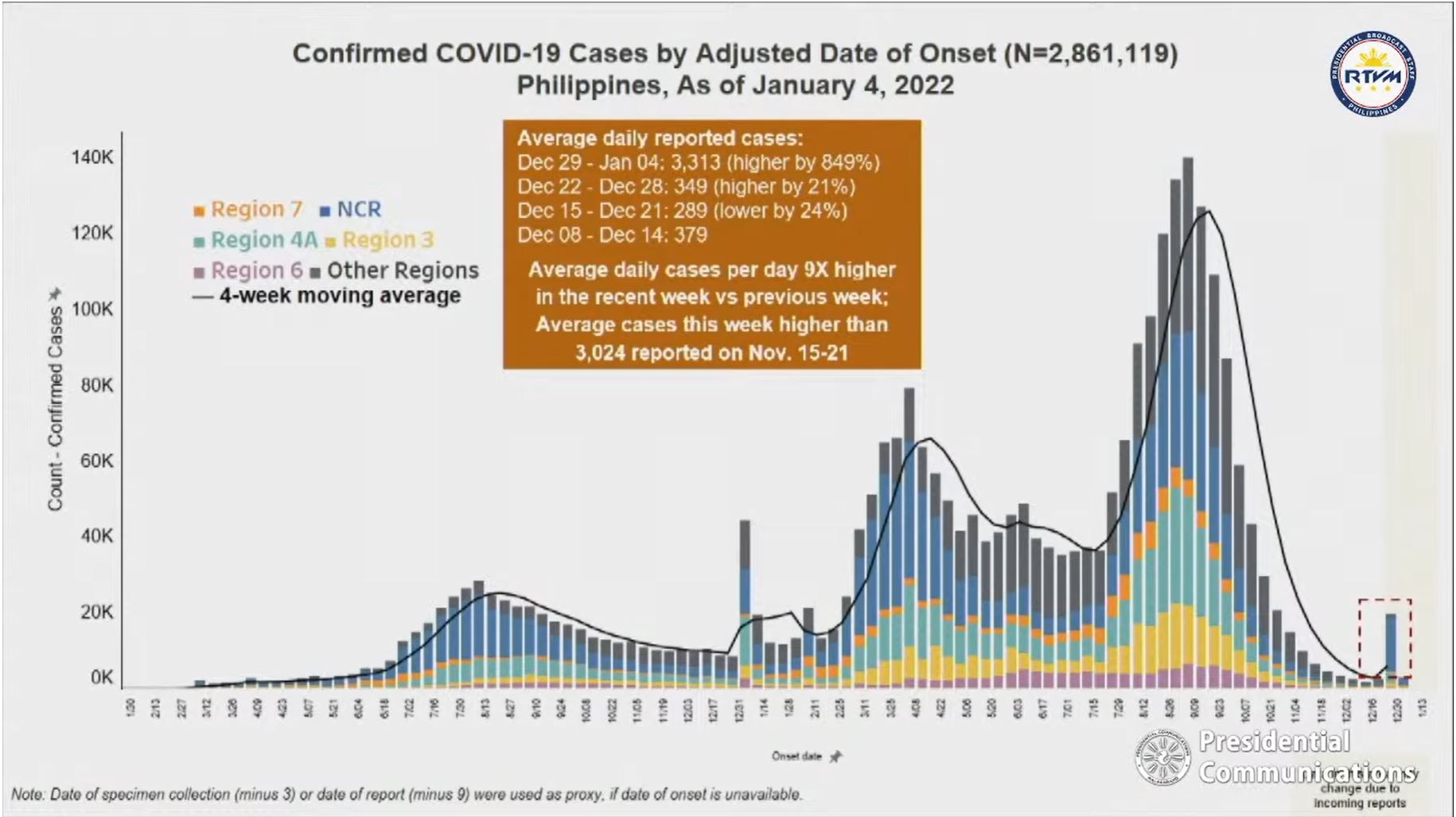 In the past week, from December 29, 2021 to January 4, 2022, the country recorded an average of 3,313 daily cases. This is nine times higher than the previous 349 average daily cases from Dec. 22 to 28, the DOH chief said.