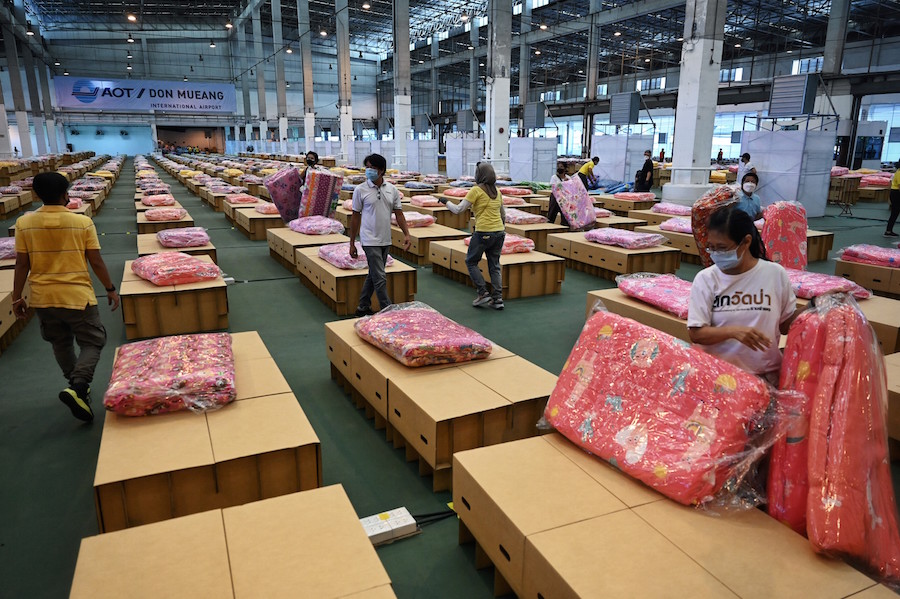 Workers prepare mattresses and blankets for 1800 cardboard beds at a field hospital at a warehouse in Don Muang International Airport in Bangkok. Thailand is among a host of Southeast Asian countries that kept infection numbers low during 2020 but now face record numbers of cases amid slow vaccination campaigns.